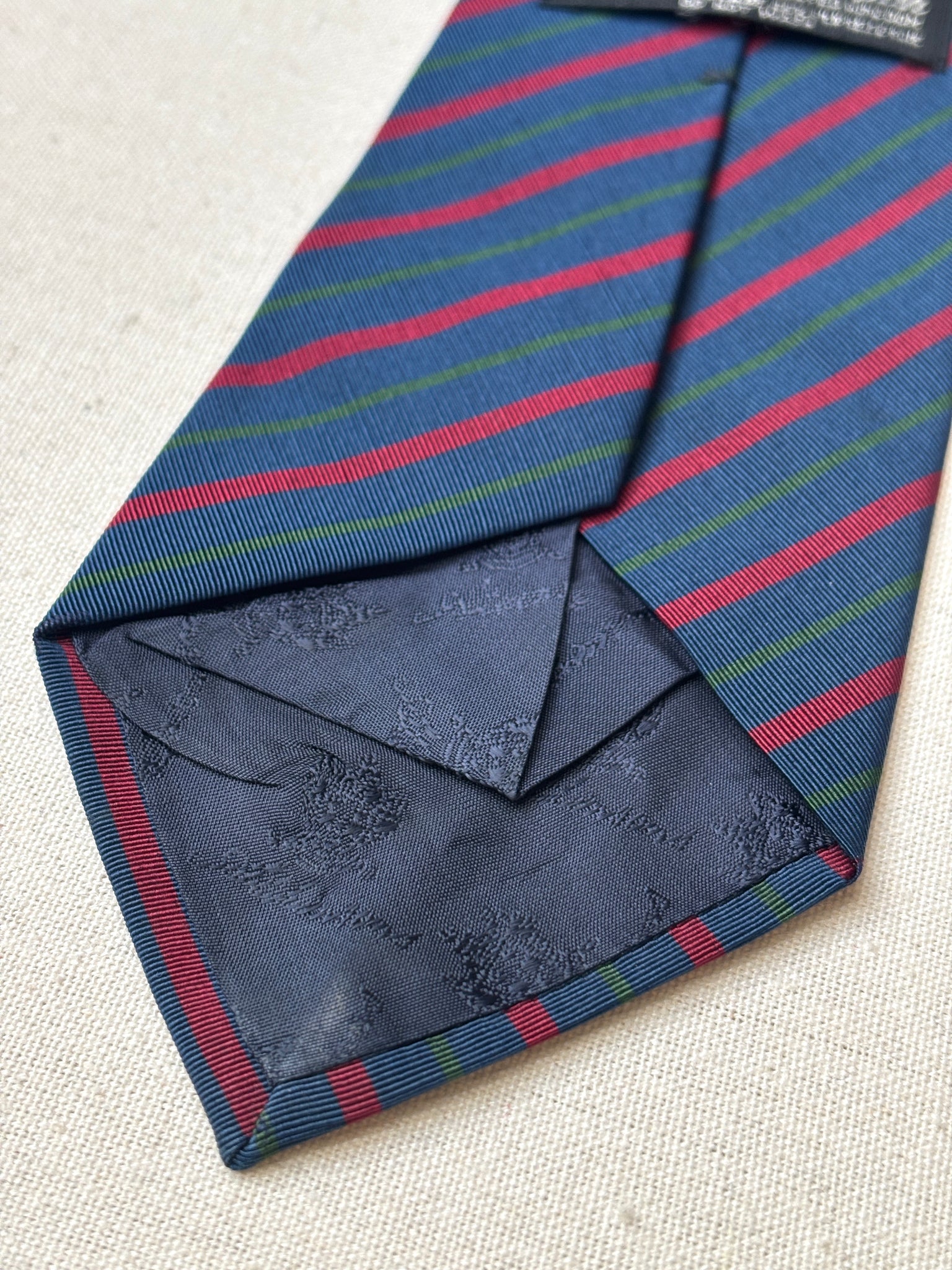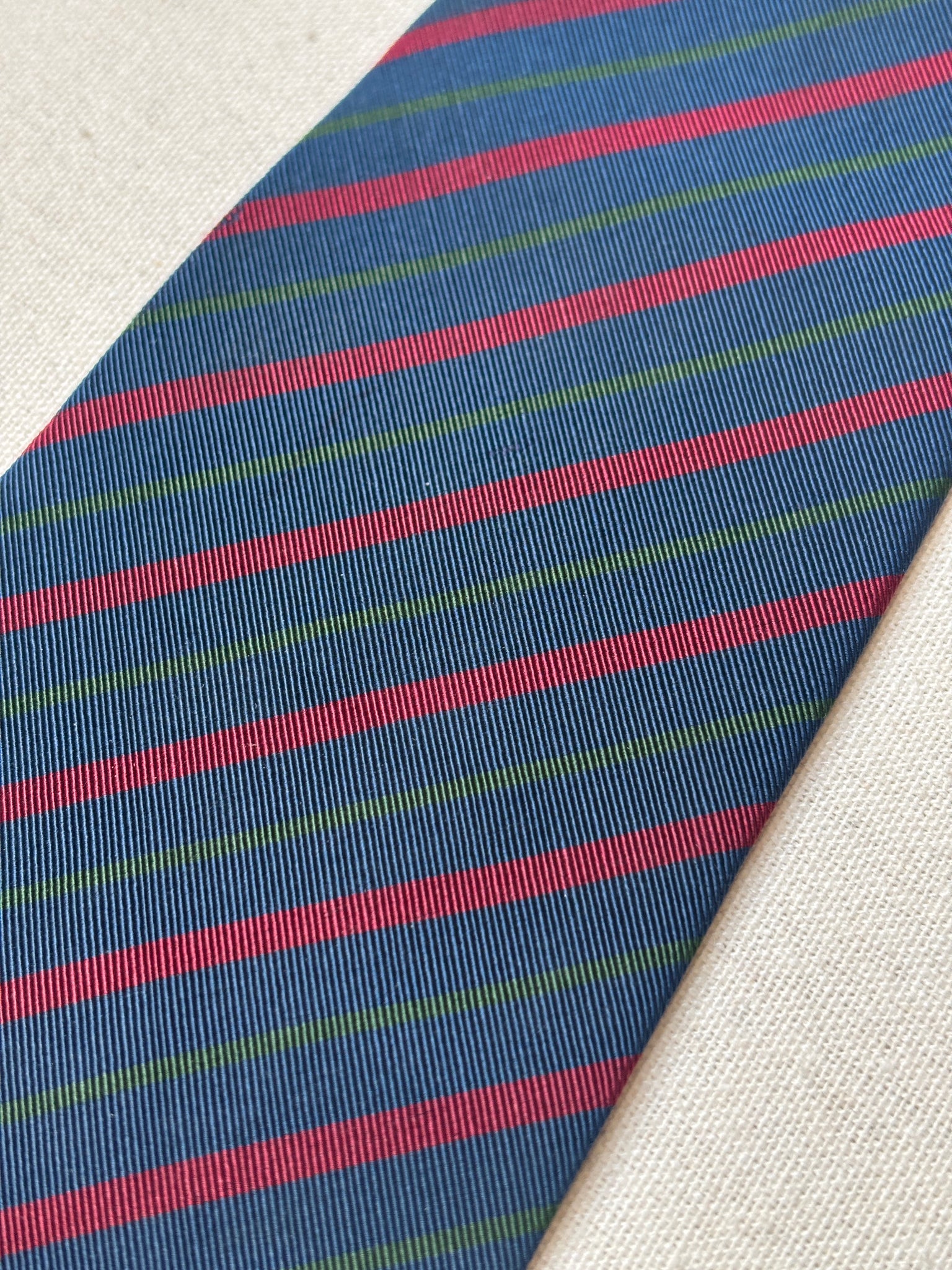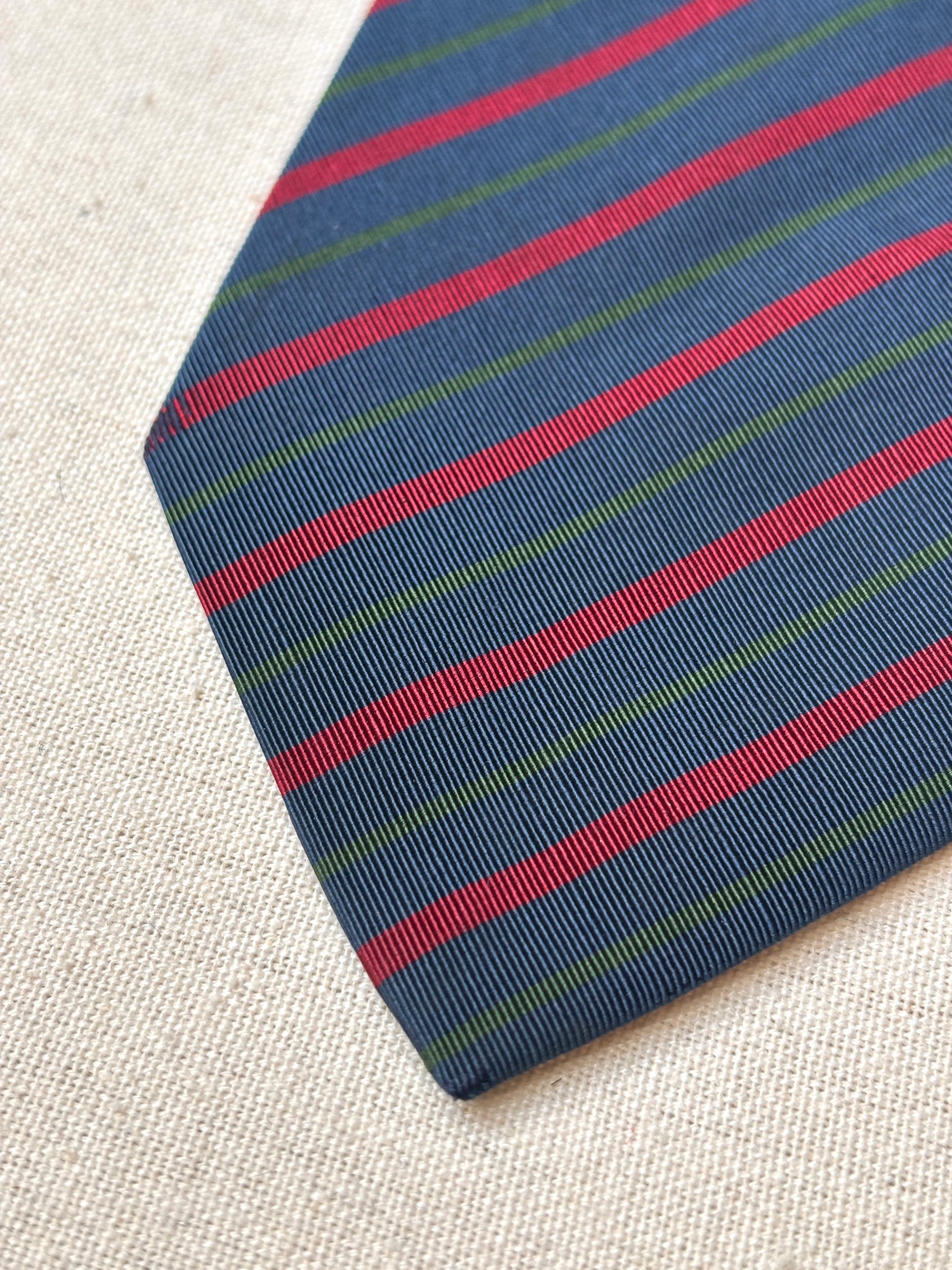 Coloris : Fond bleu marine, rayures vertes et rouges.