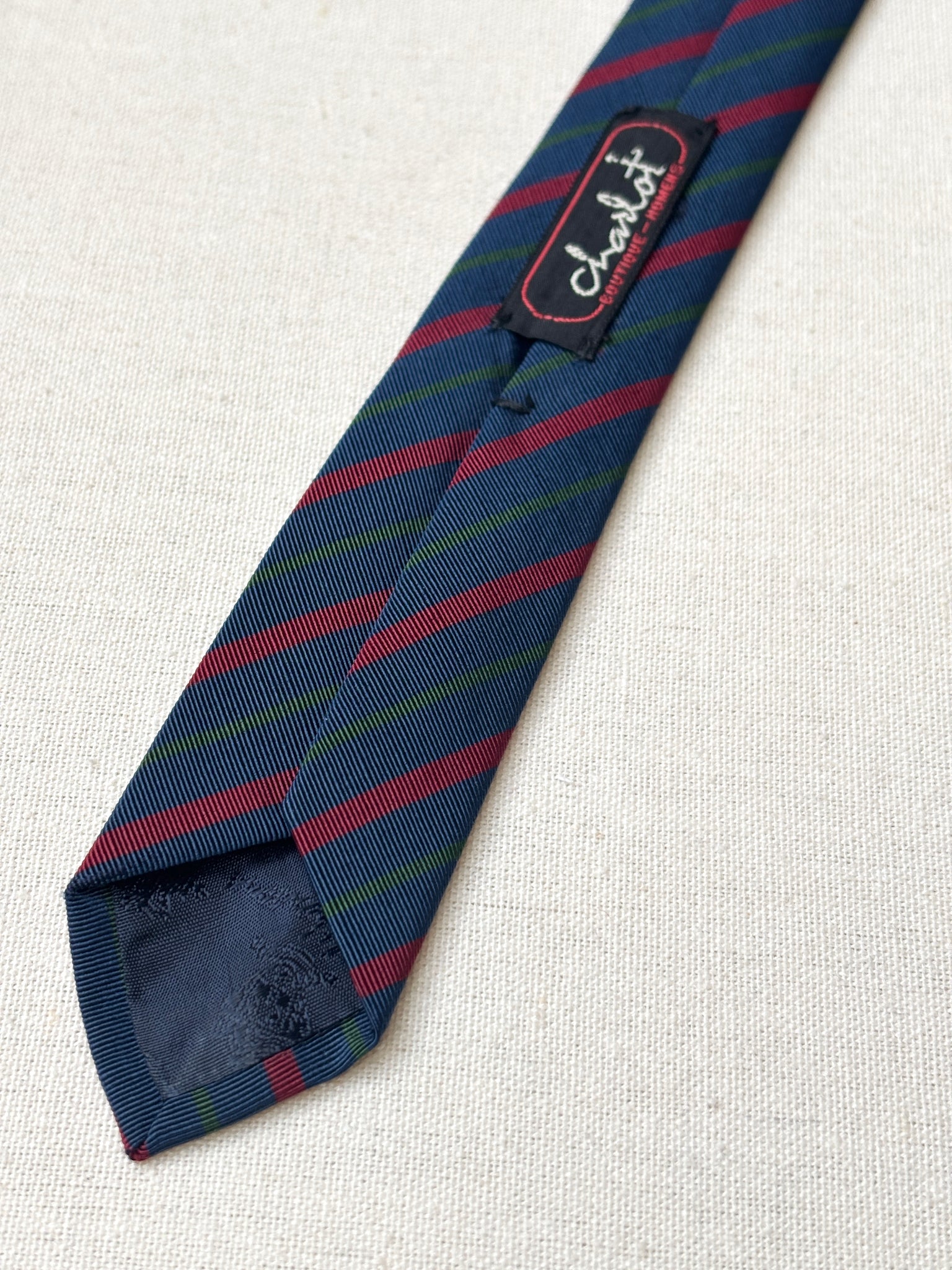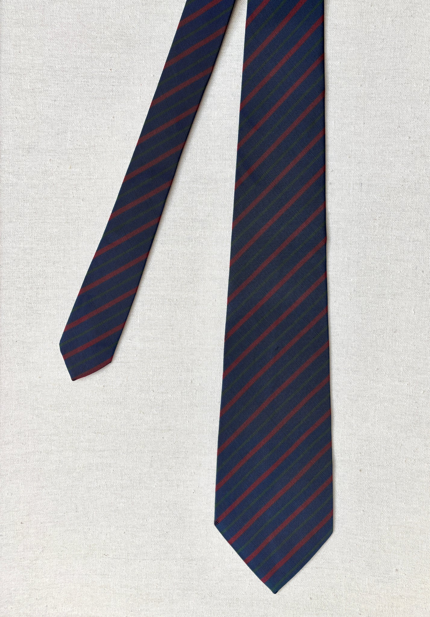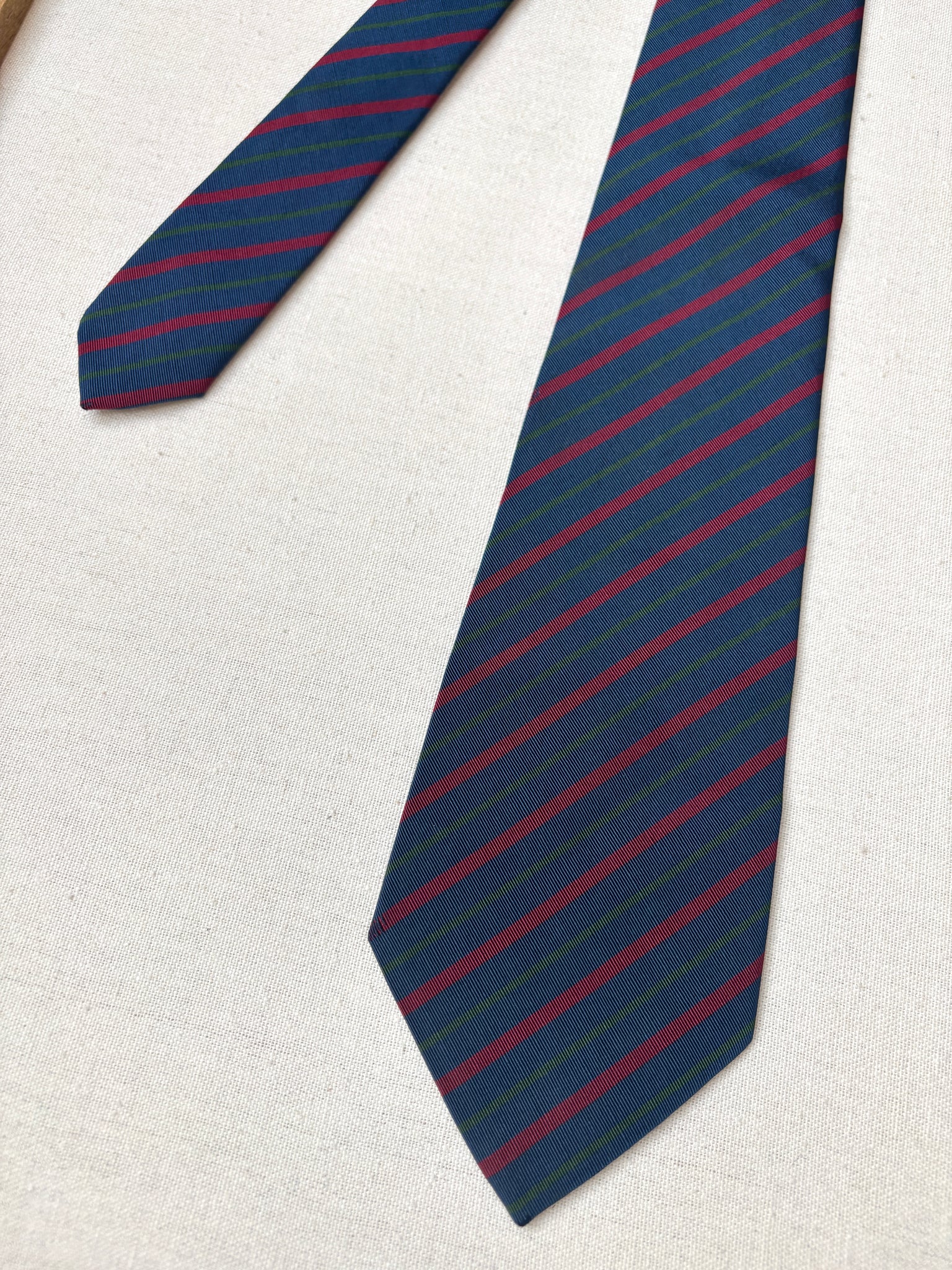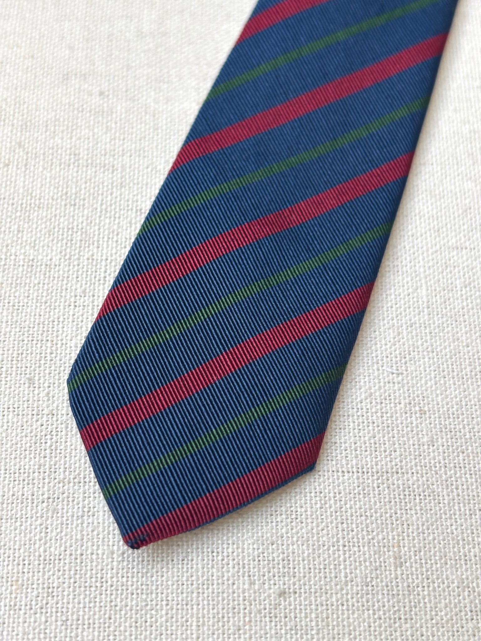 Coloris : Fond bleu marine, rayures vertes et rouges.