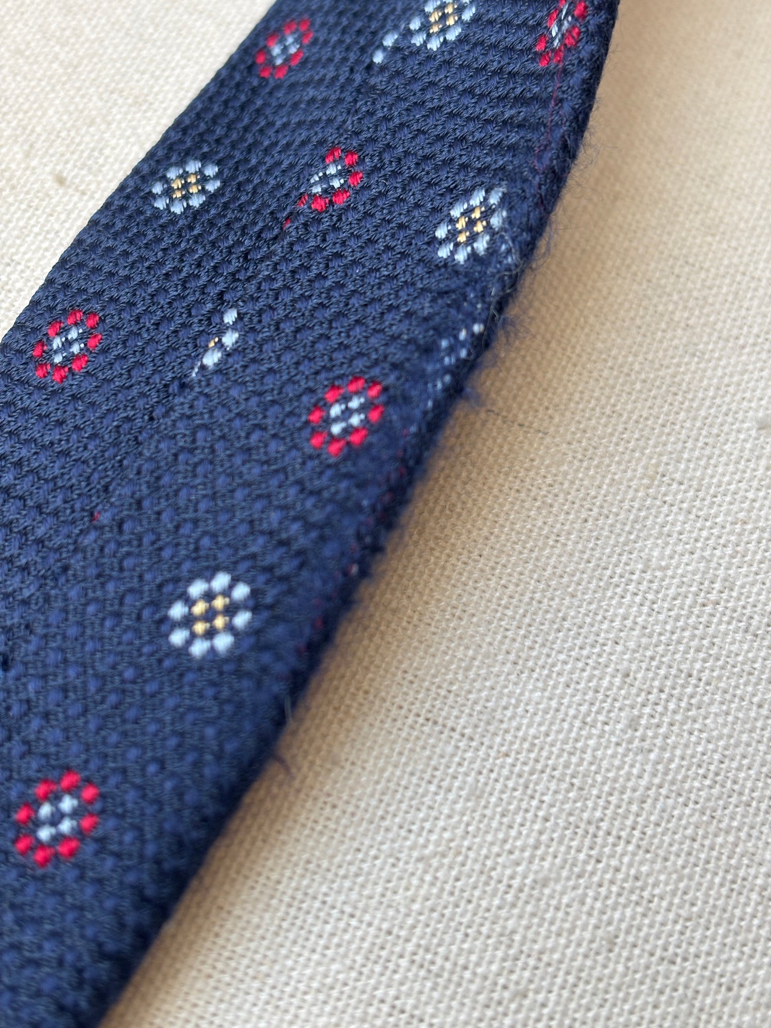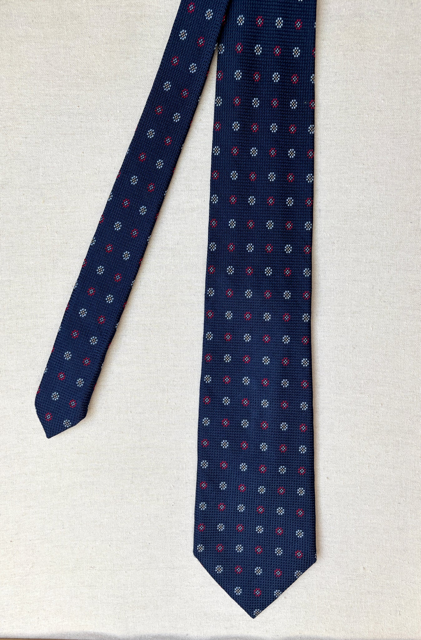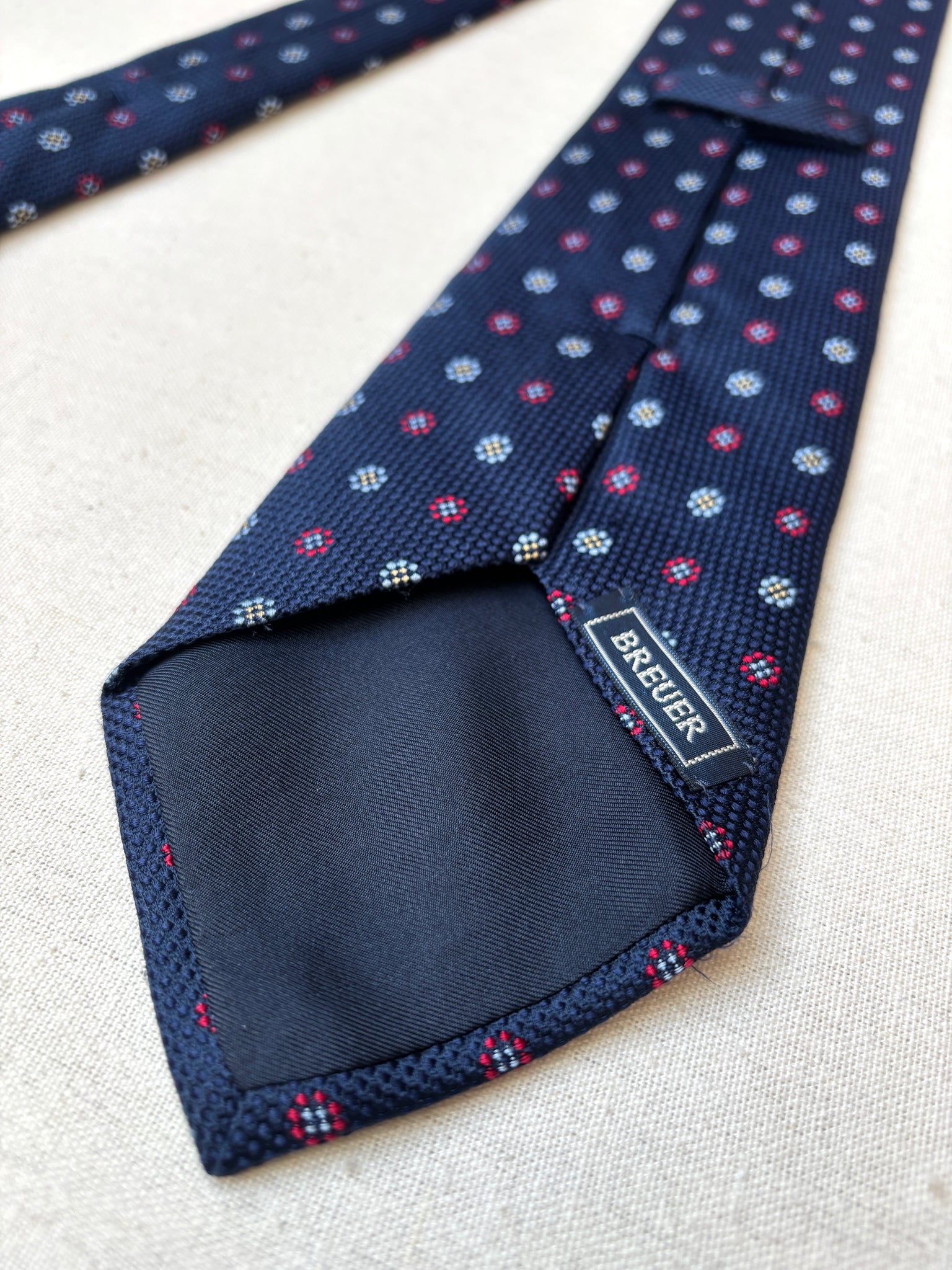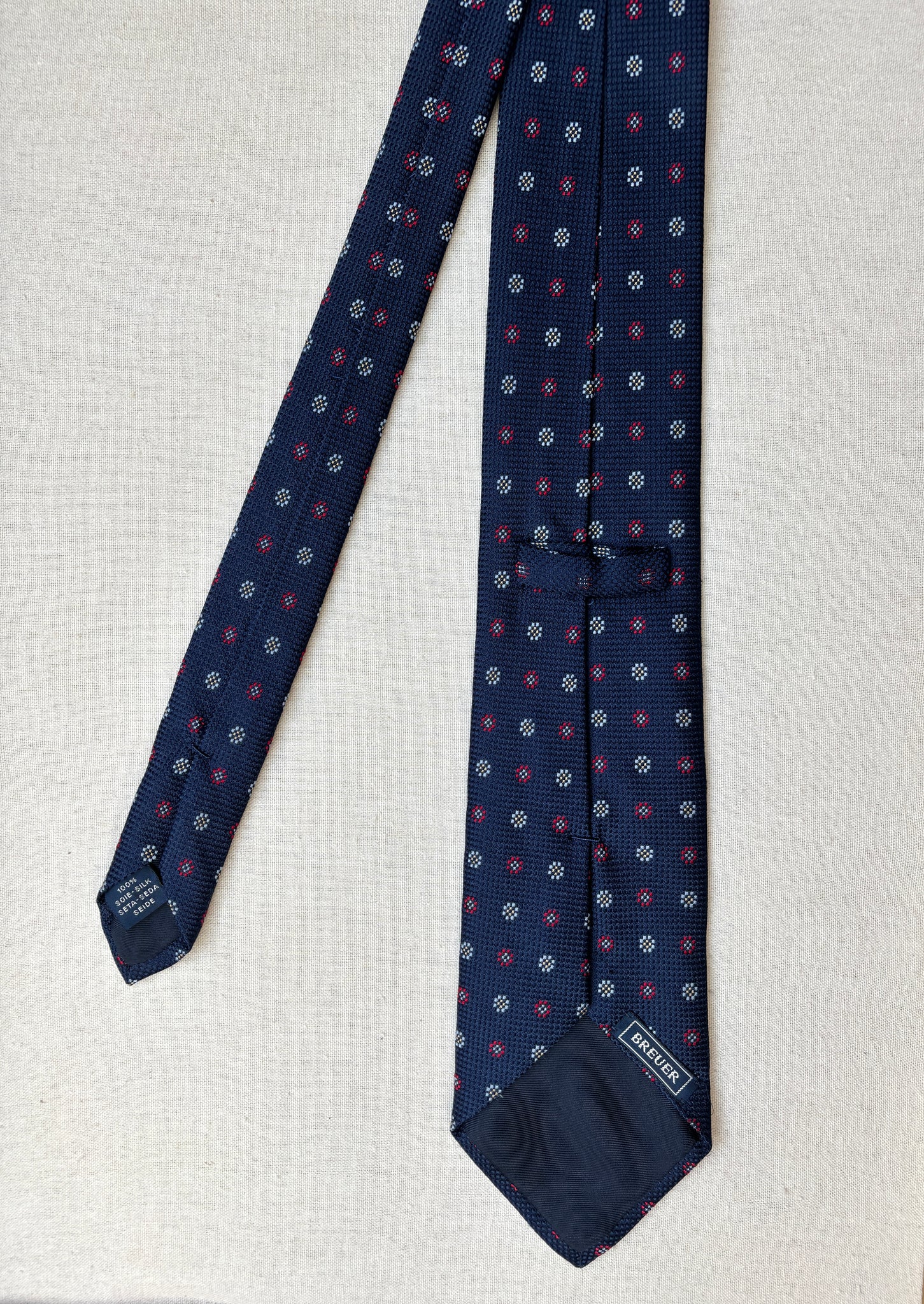 1/ Breuer cravate à motif géométrique texturée en soie, fabriquée en France.