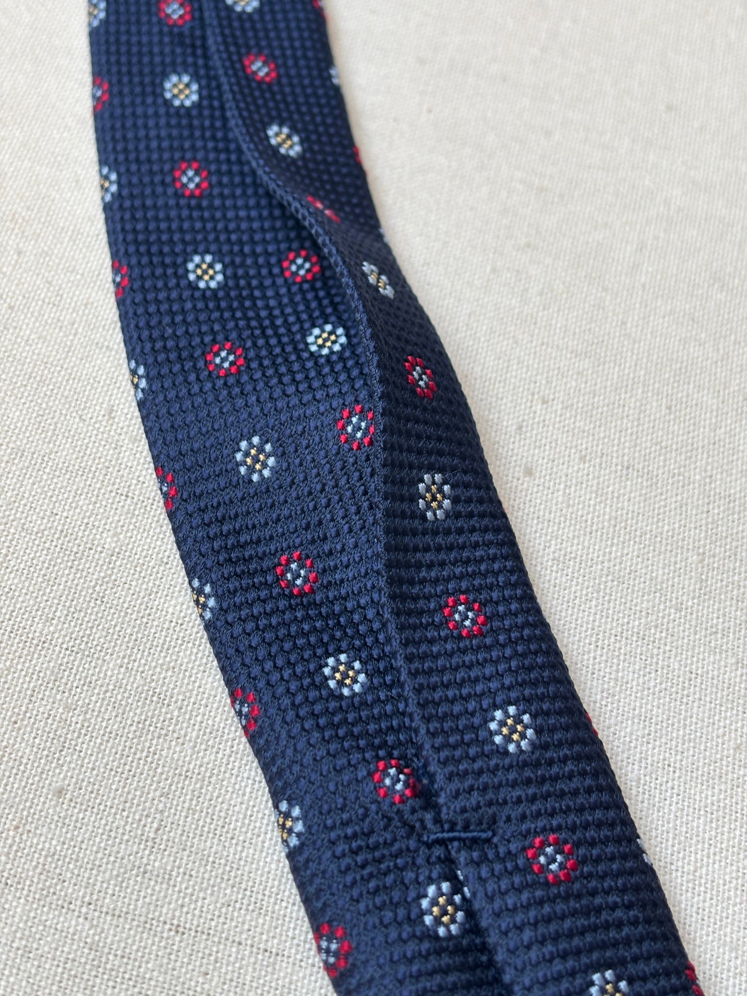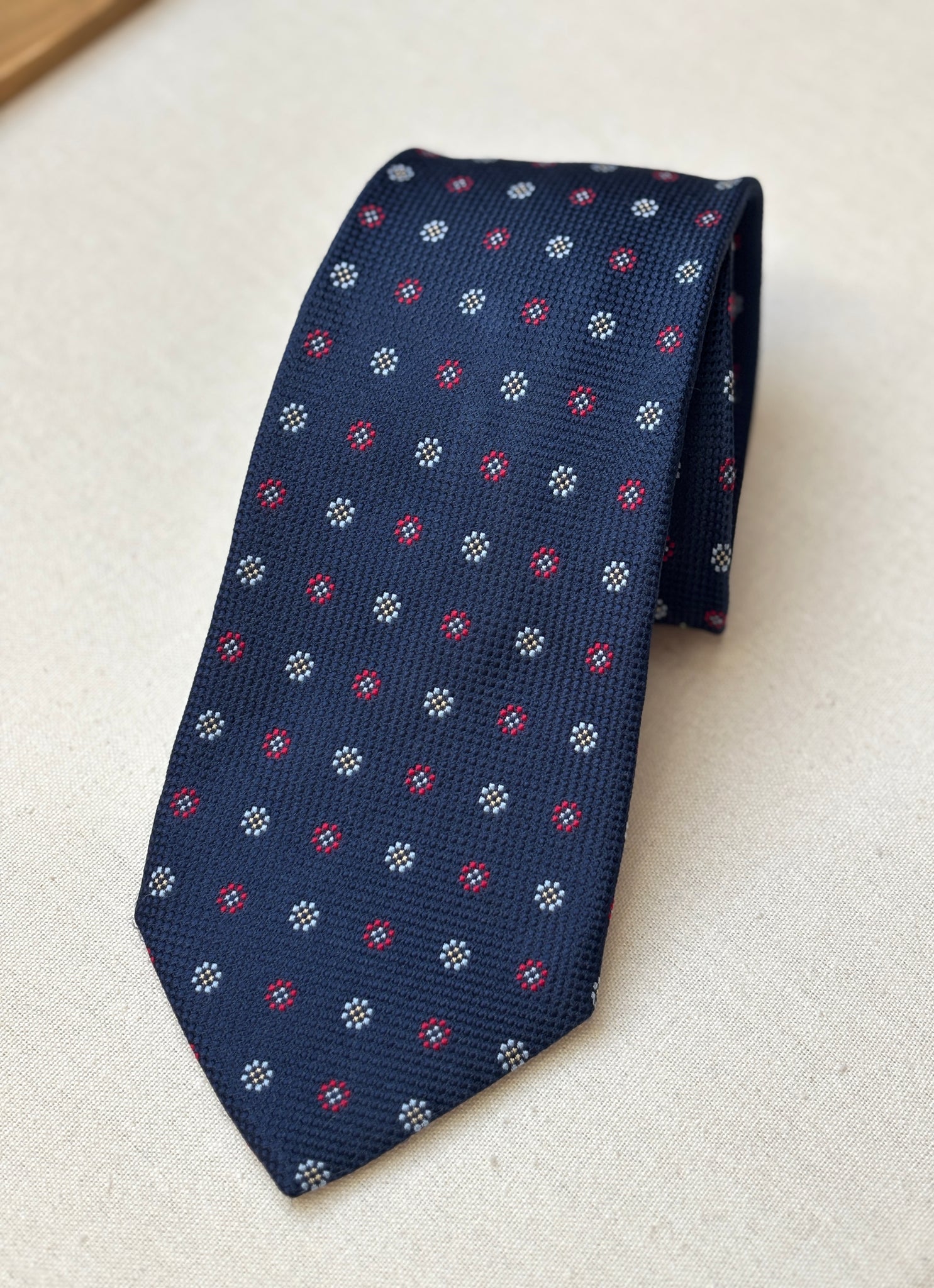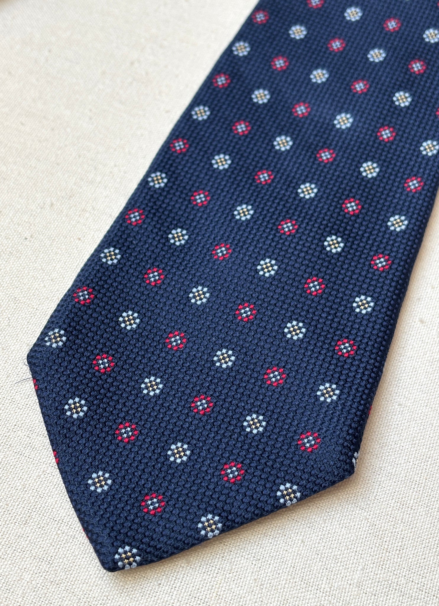 1/ Breuer cravate à motif géométrique texturée en soie, fabriquée en France.