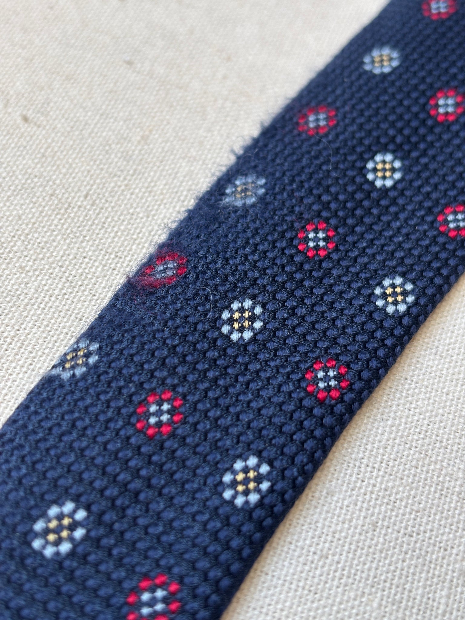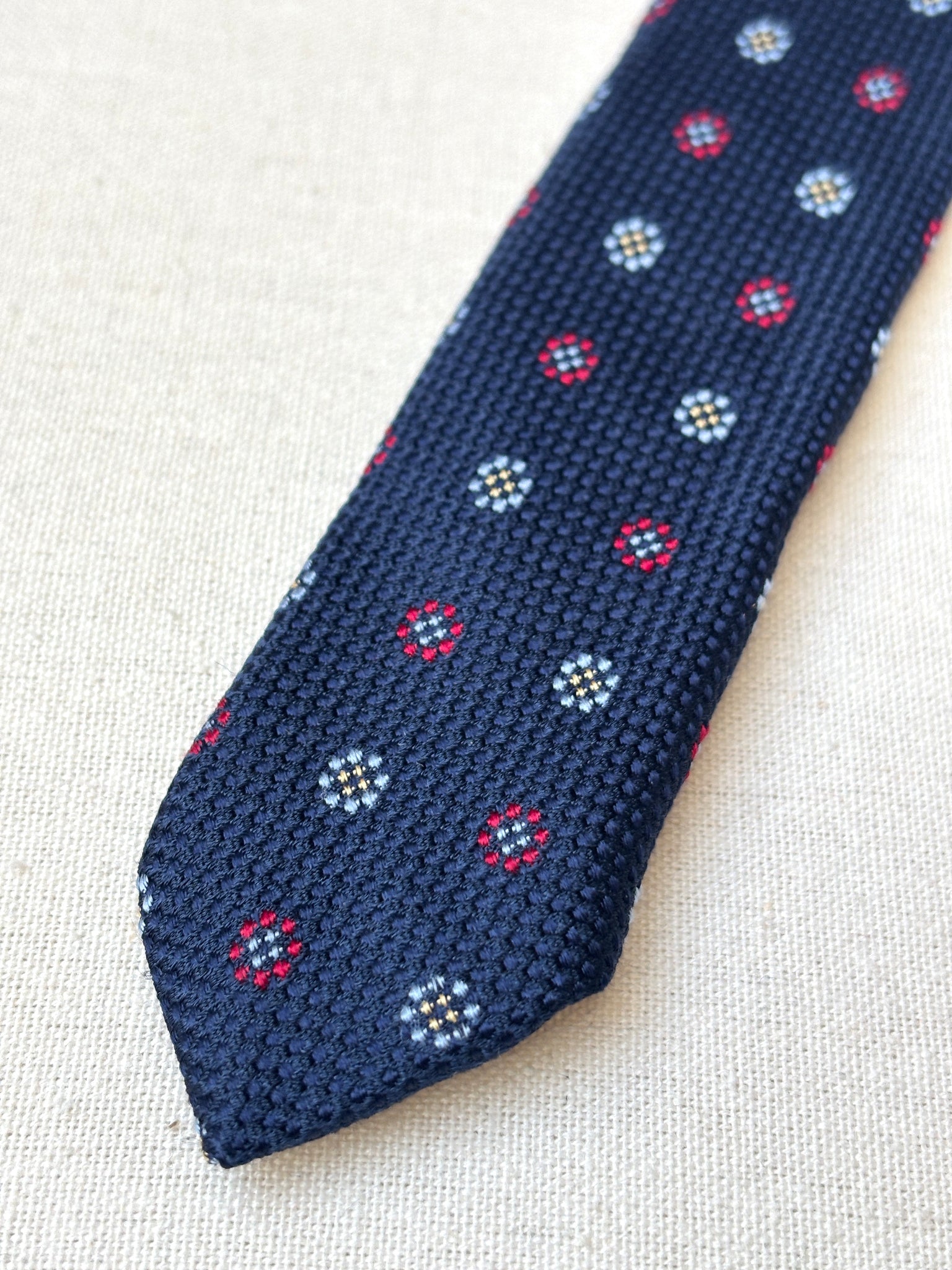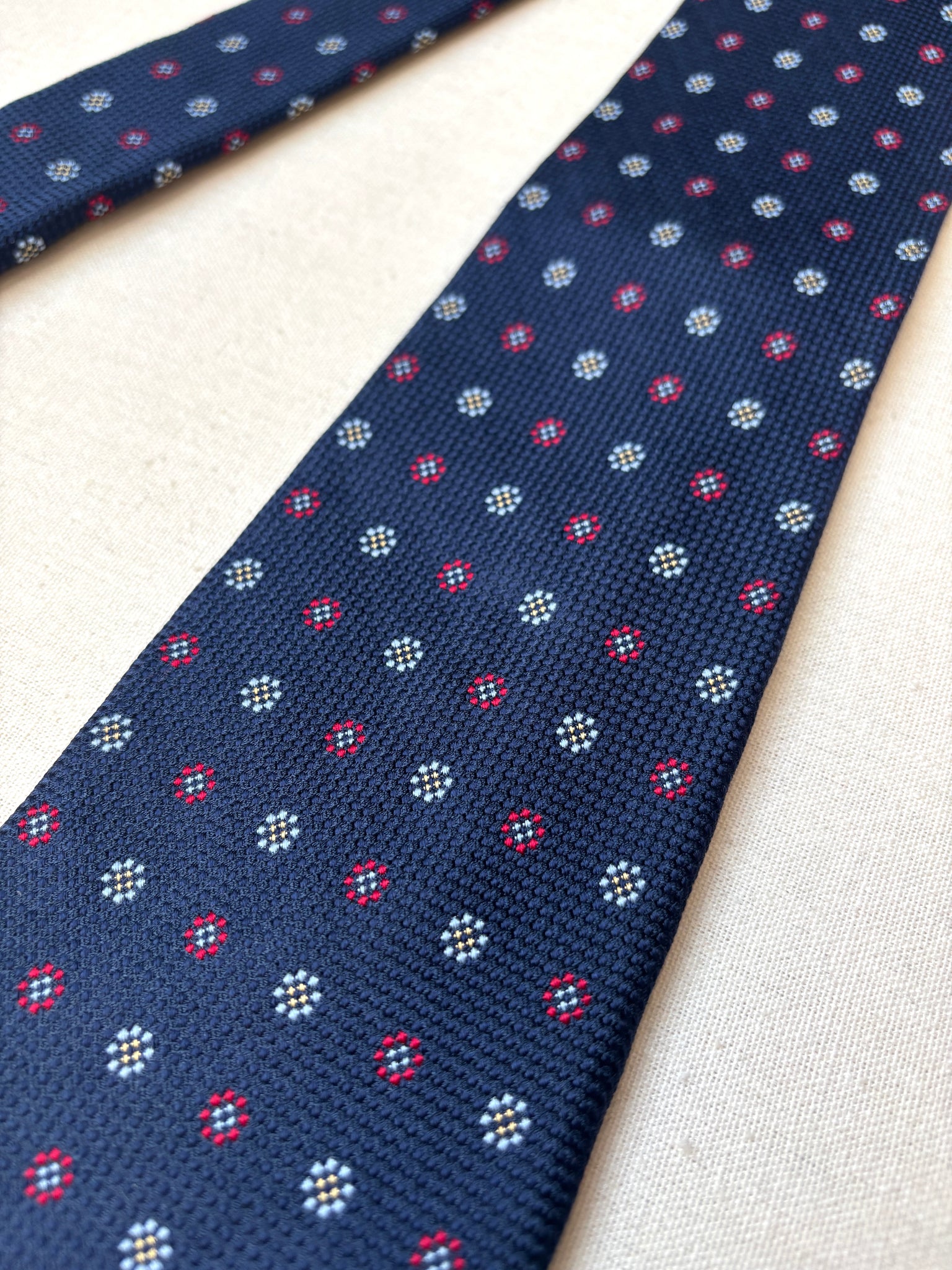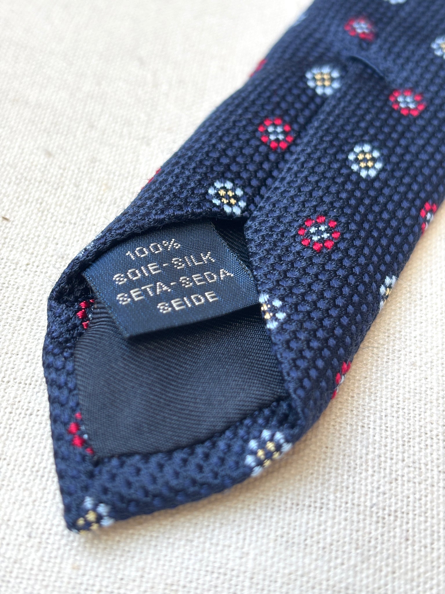 1/ Breuer cravate à motif géométrique texturée en soie, fabriquée en France.
