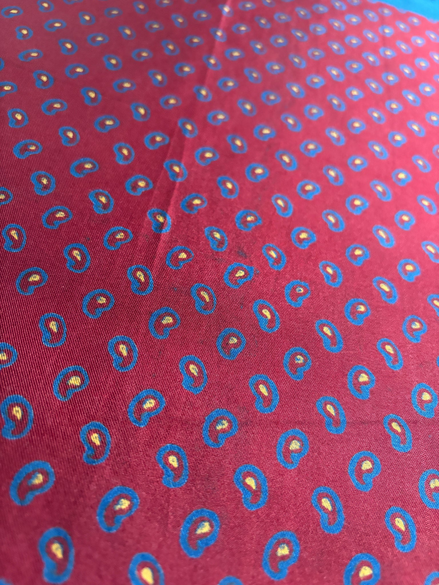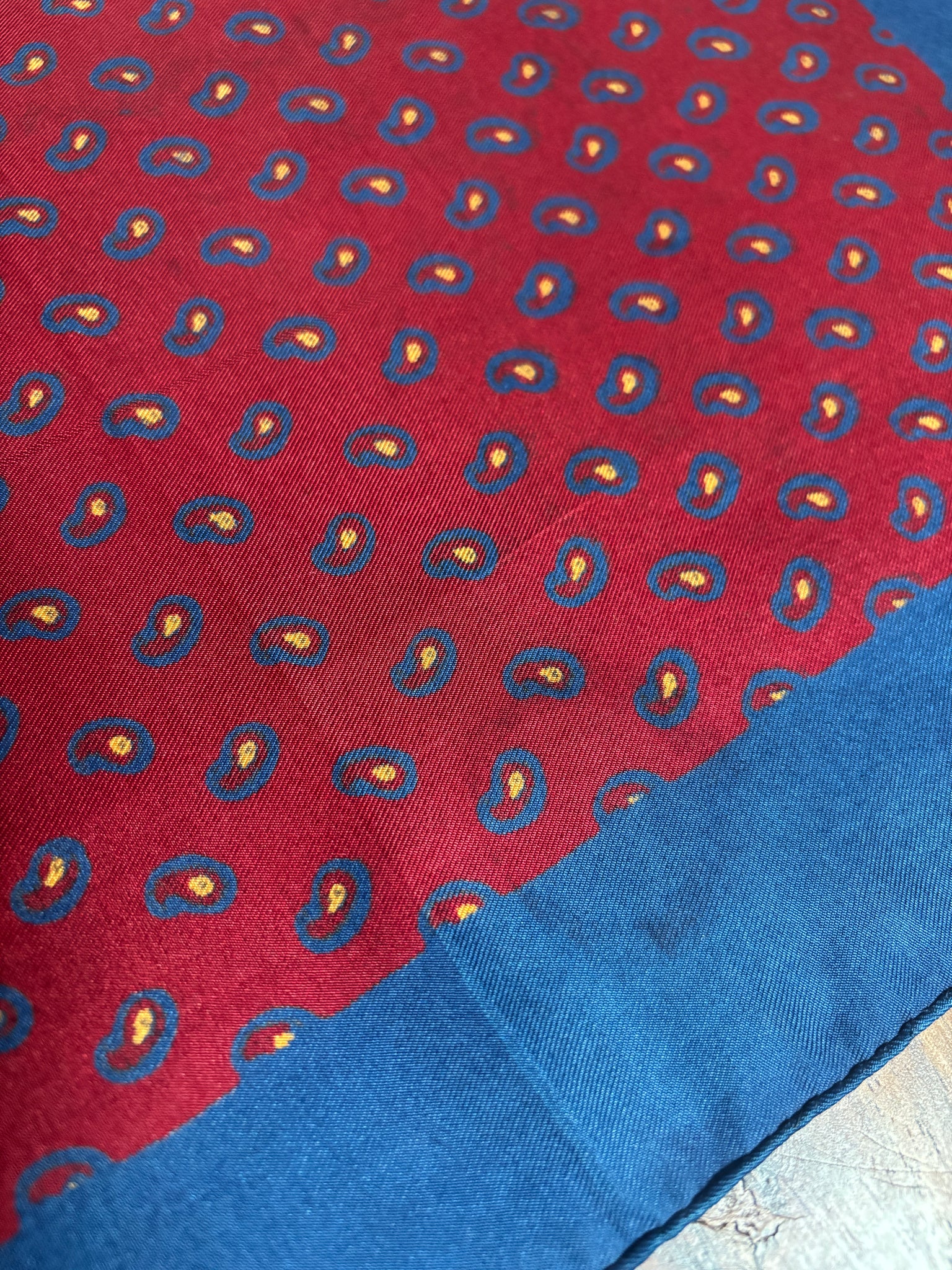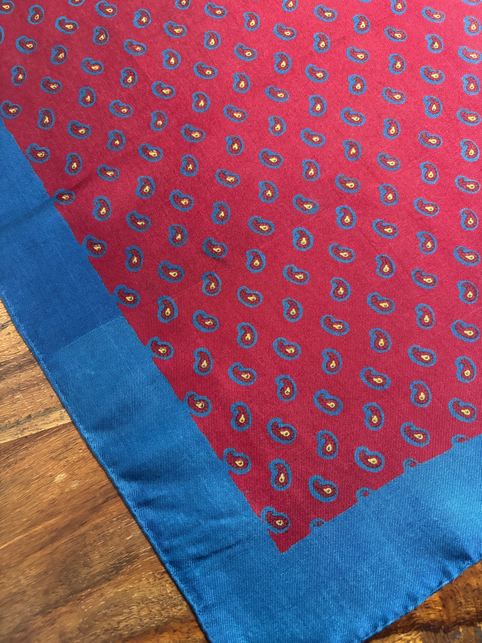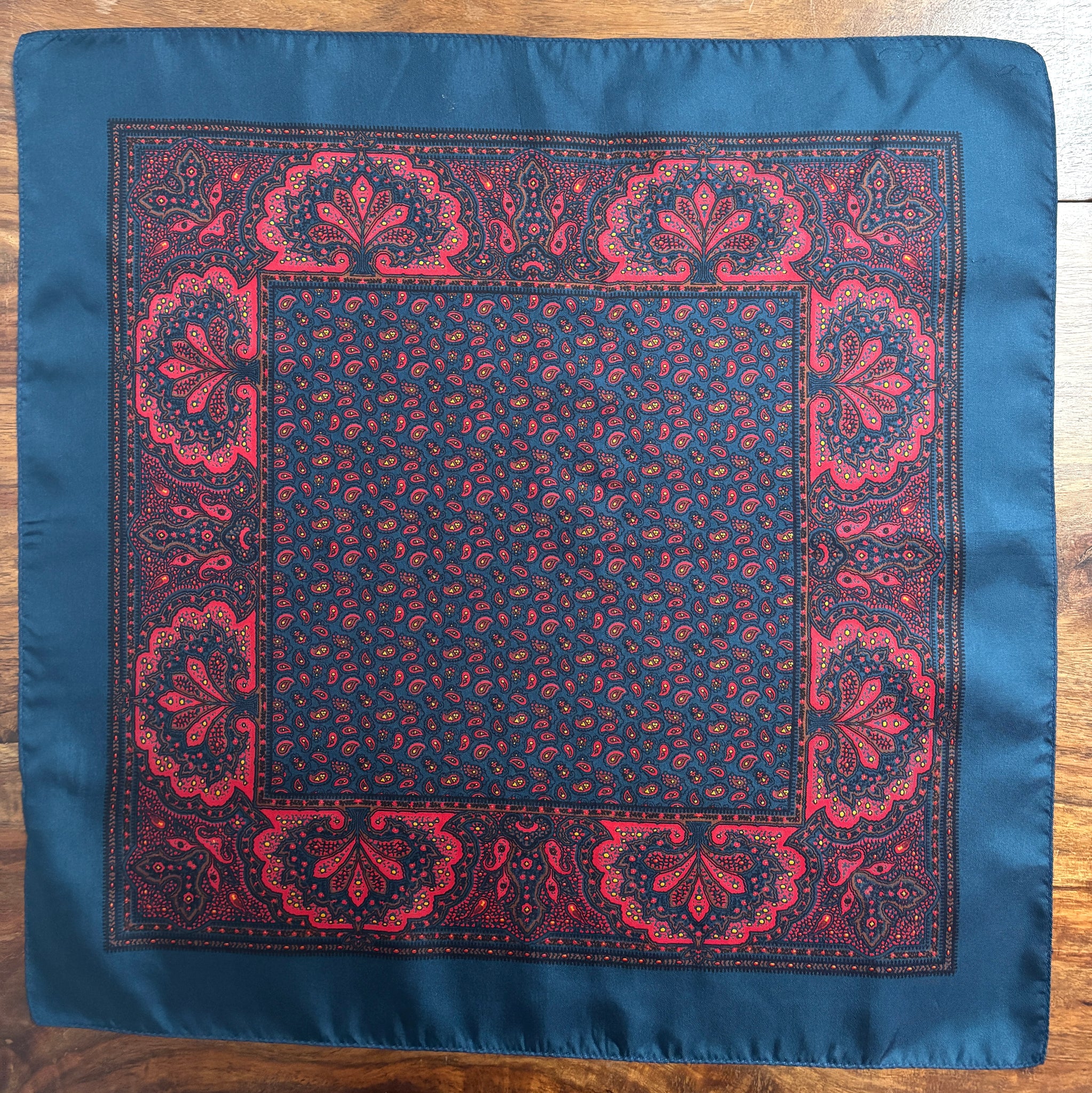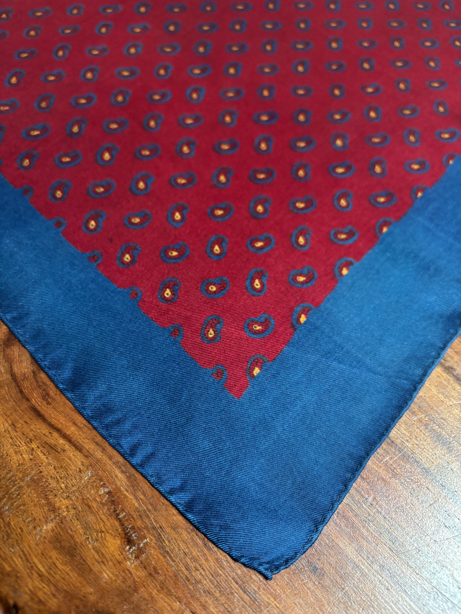 1/ Pochette paisley rouge et bleue en soie, fabriquée en Angleterre