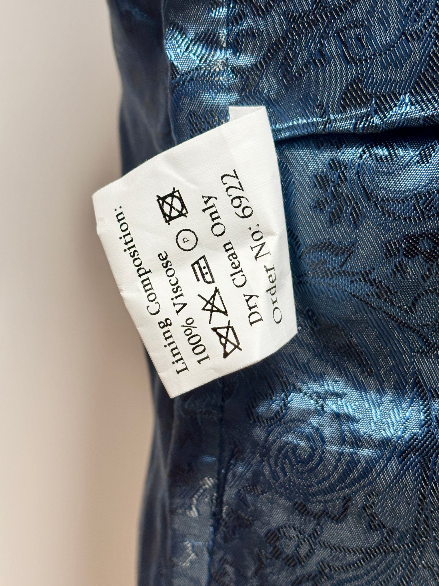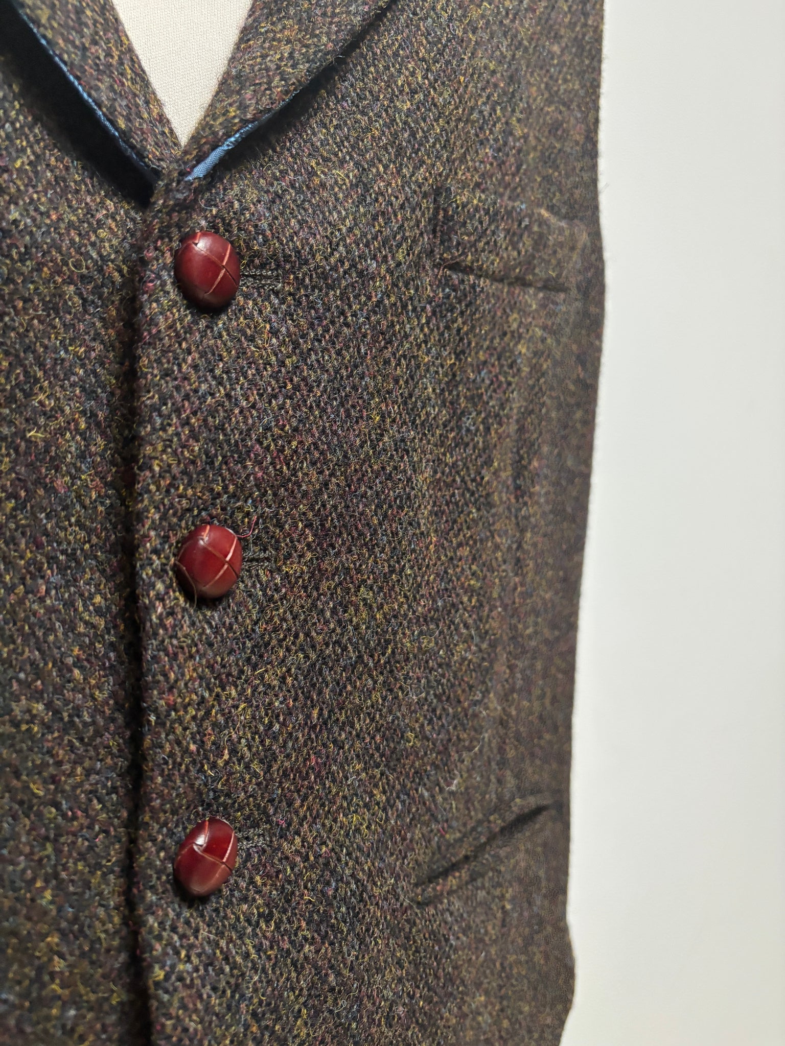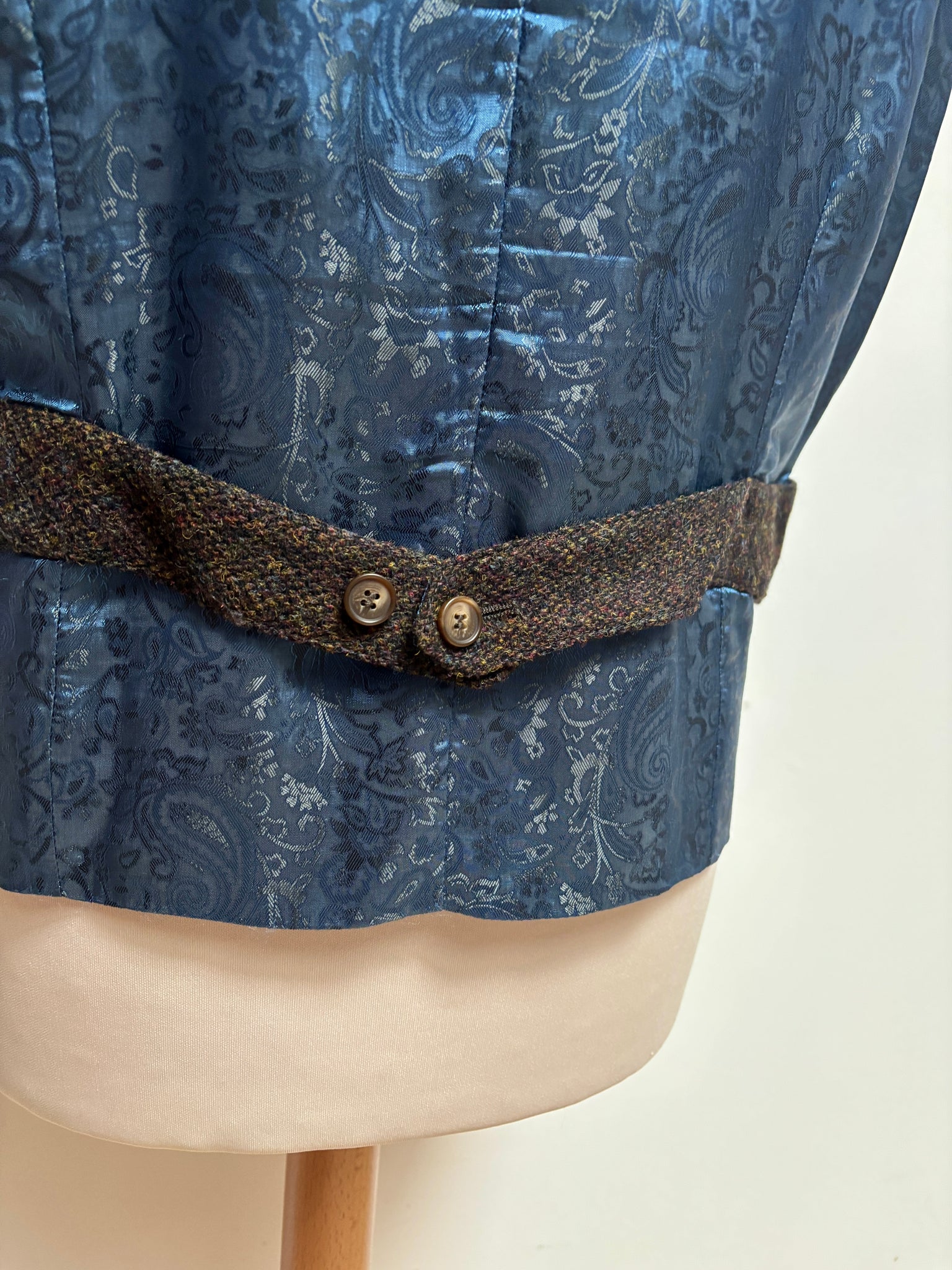 Caractéristiques : Coupe classique, col revers, drap de laine en tweed, patte à cinq boutons, jolis boutons en cuir marron, quatre poches cousues à l'avant du gilet, patte boutonnée réglable à l'arrière. Entièrement doublé, doublure paisley bleue soyeuse.