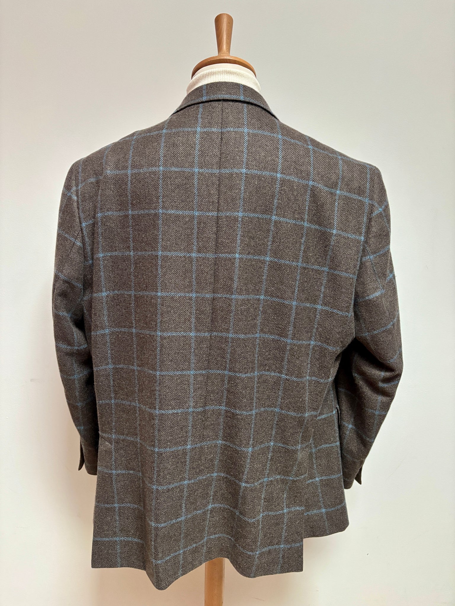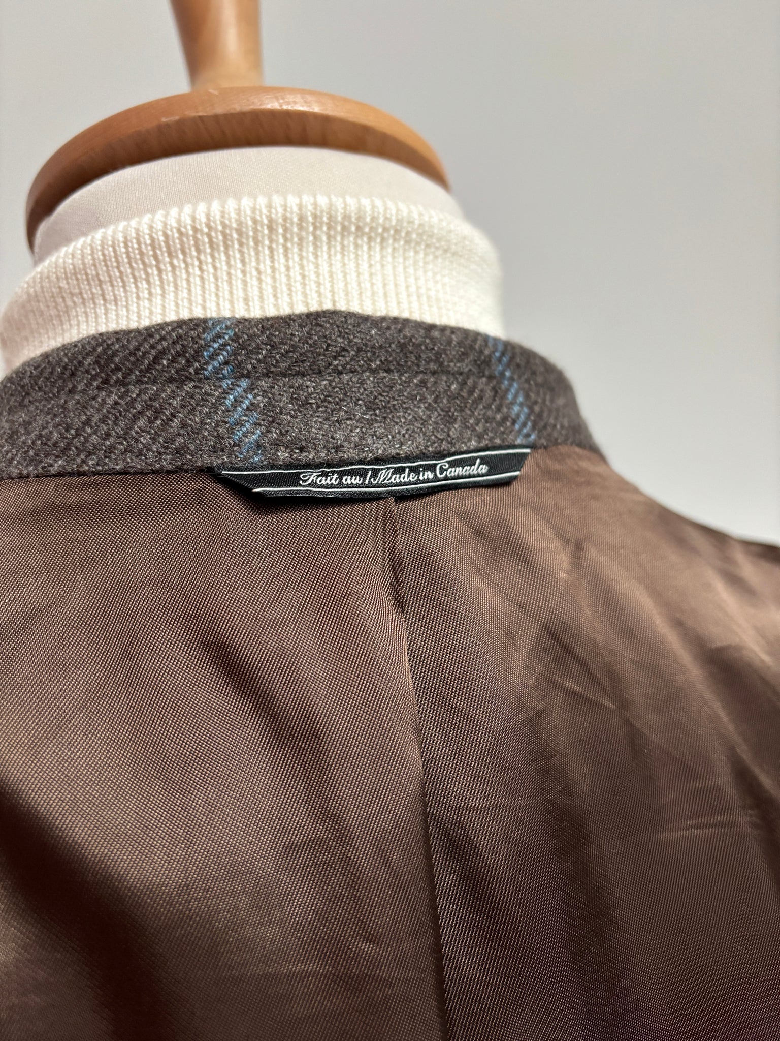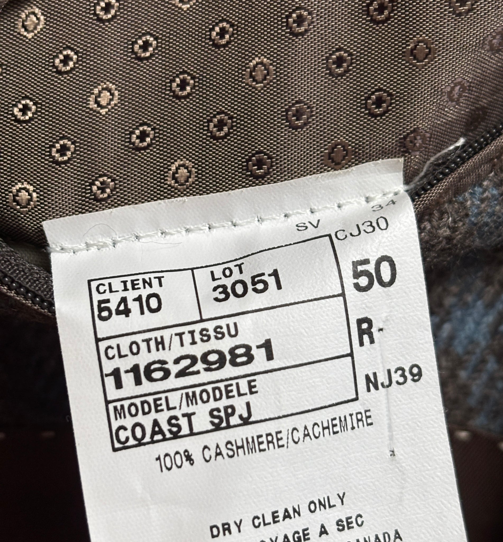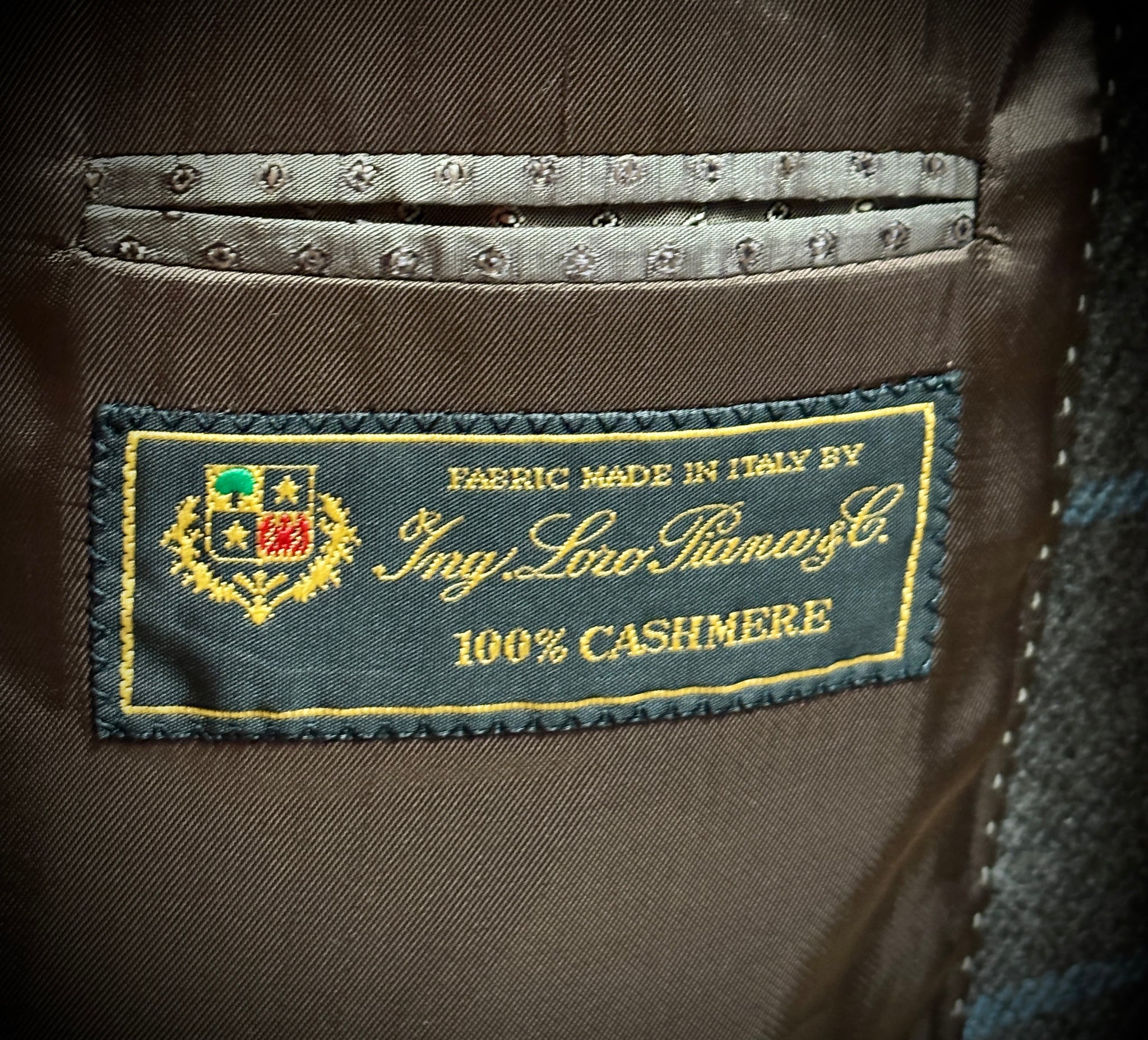Krásné hnědo-modré kašmírové sako s okénky od Loro Piana, s označením Clotherie Phoenix, vyrobené v Kanadě.