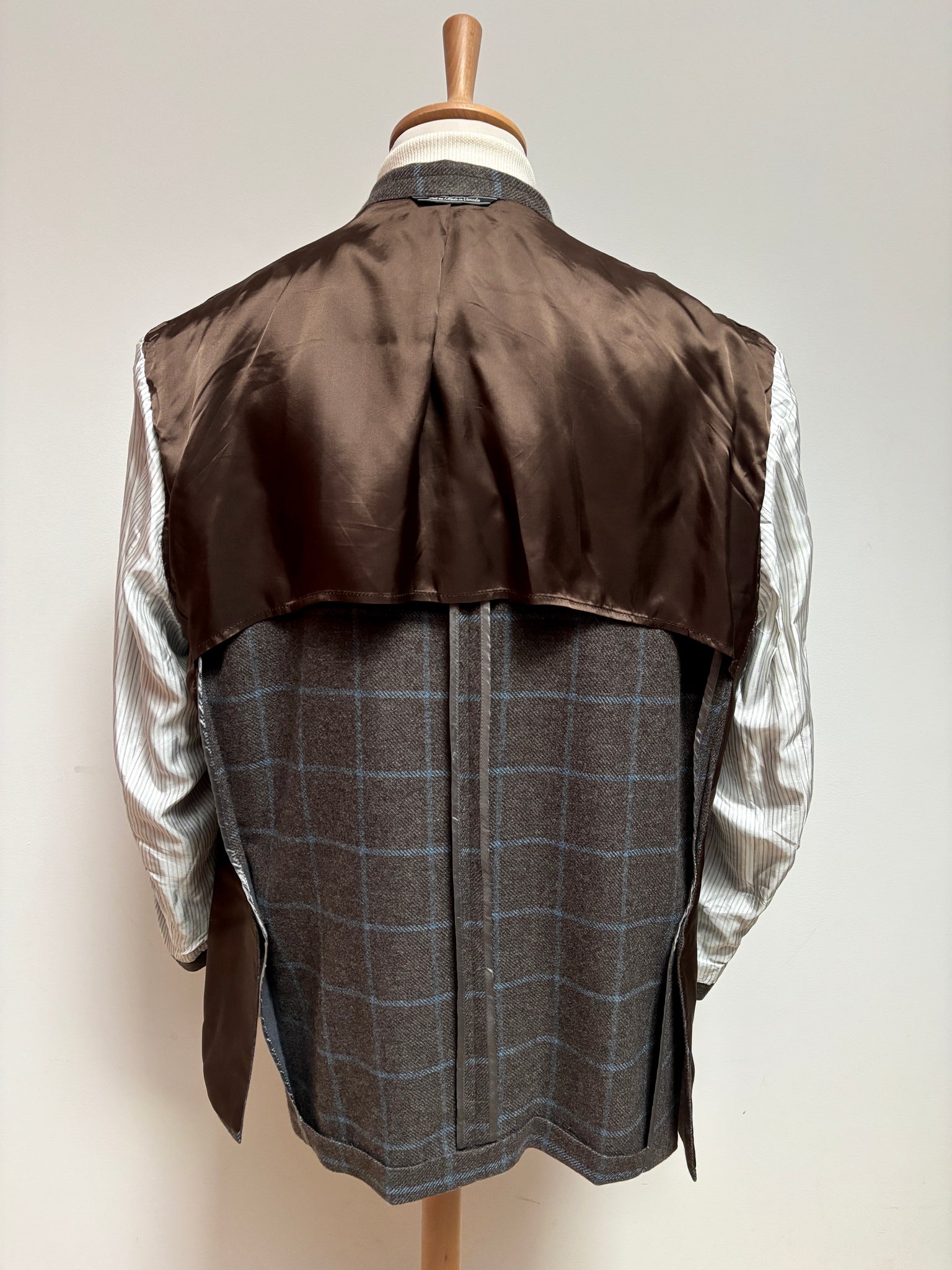 Vlastnosti: Kostkovaná tkanina s okénky, sako na dva knoflíky, polopodšité, dvě vnější klopové kapsy, dvě vnitřní kapsy na zip, větrací otvory.