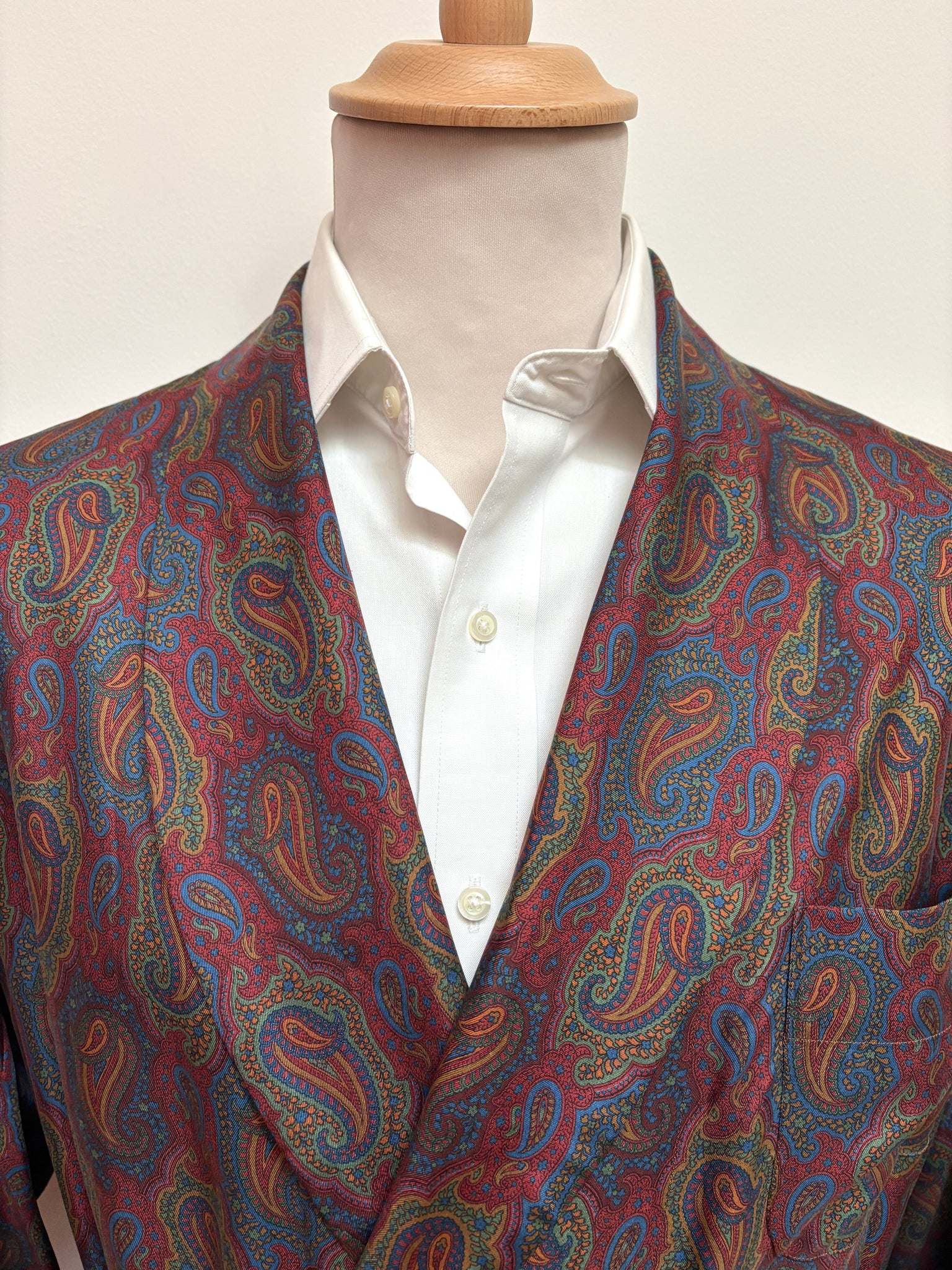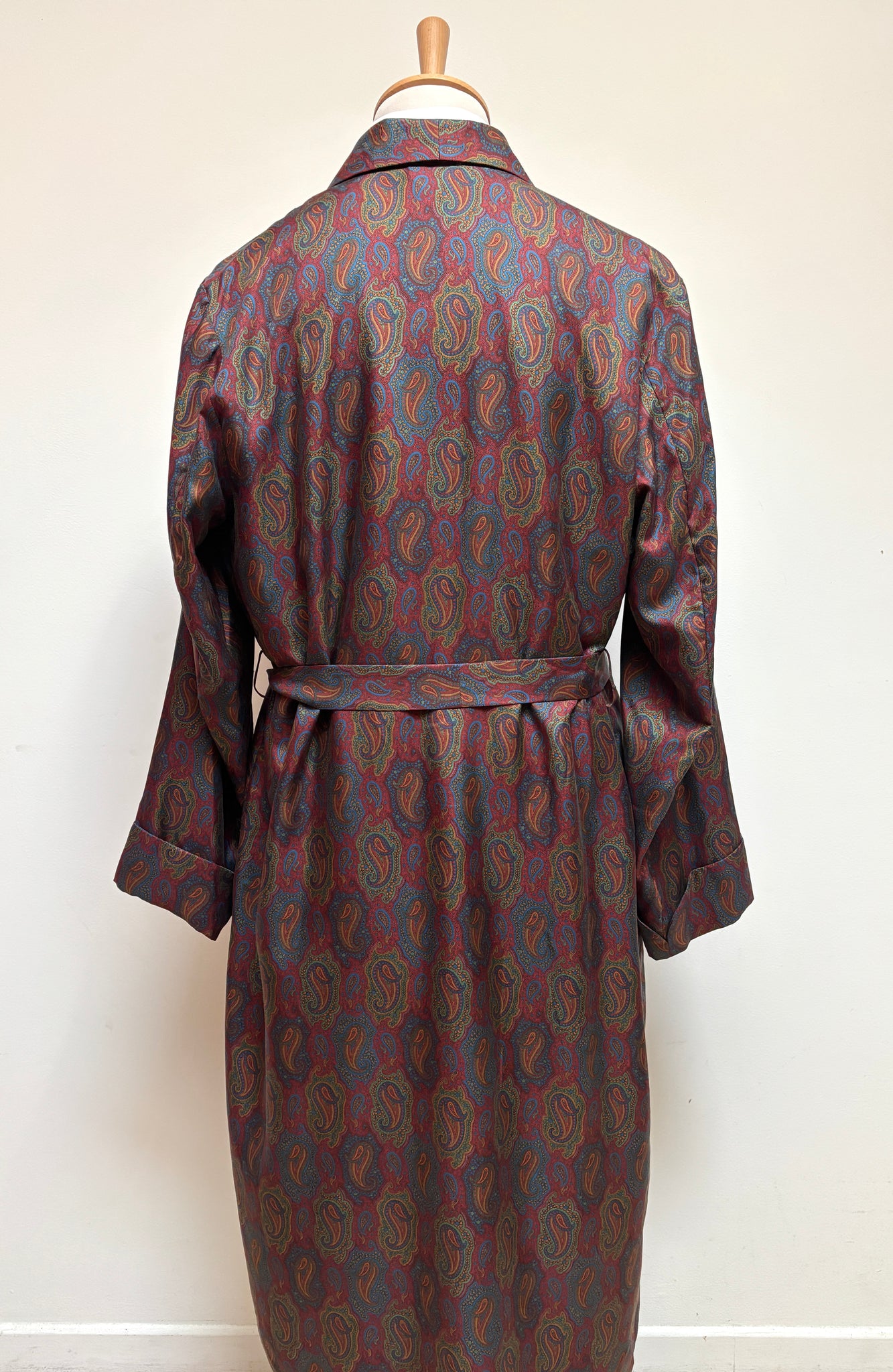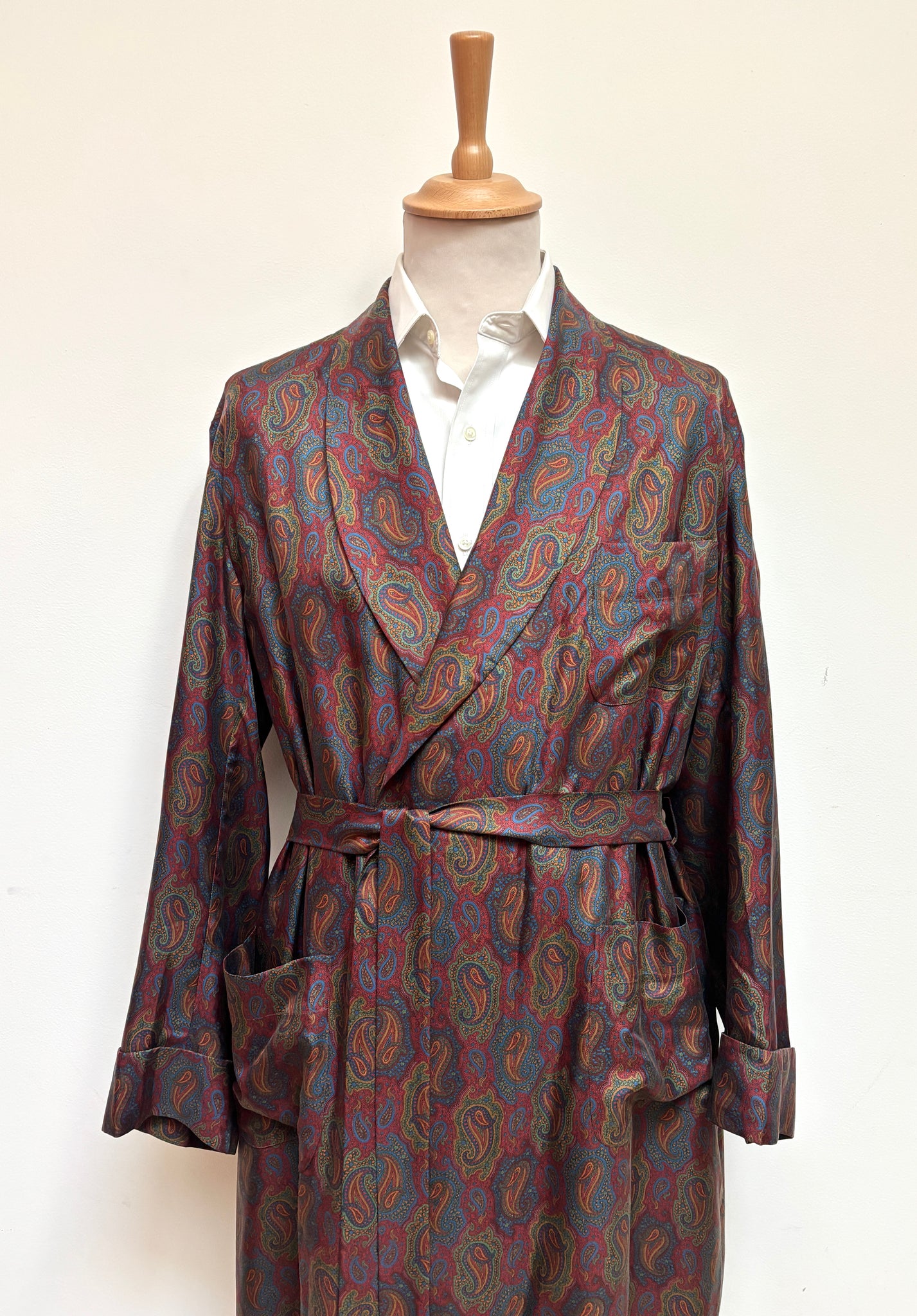 Caractéristiques : Motif paisley, col châle, ceinture à nouer, trois poches plaquées.