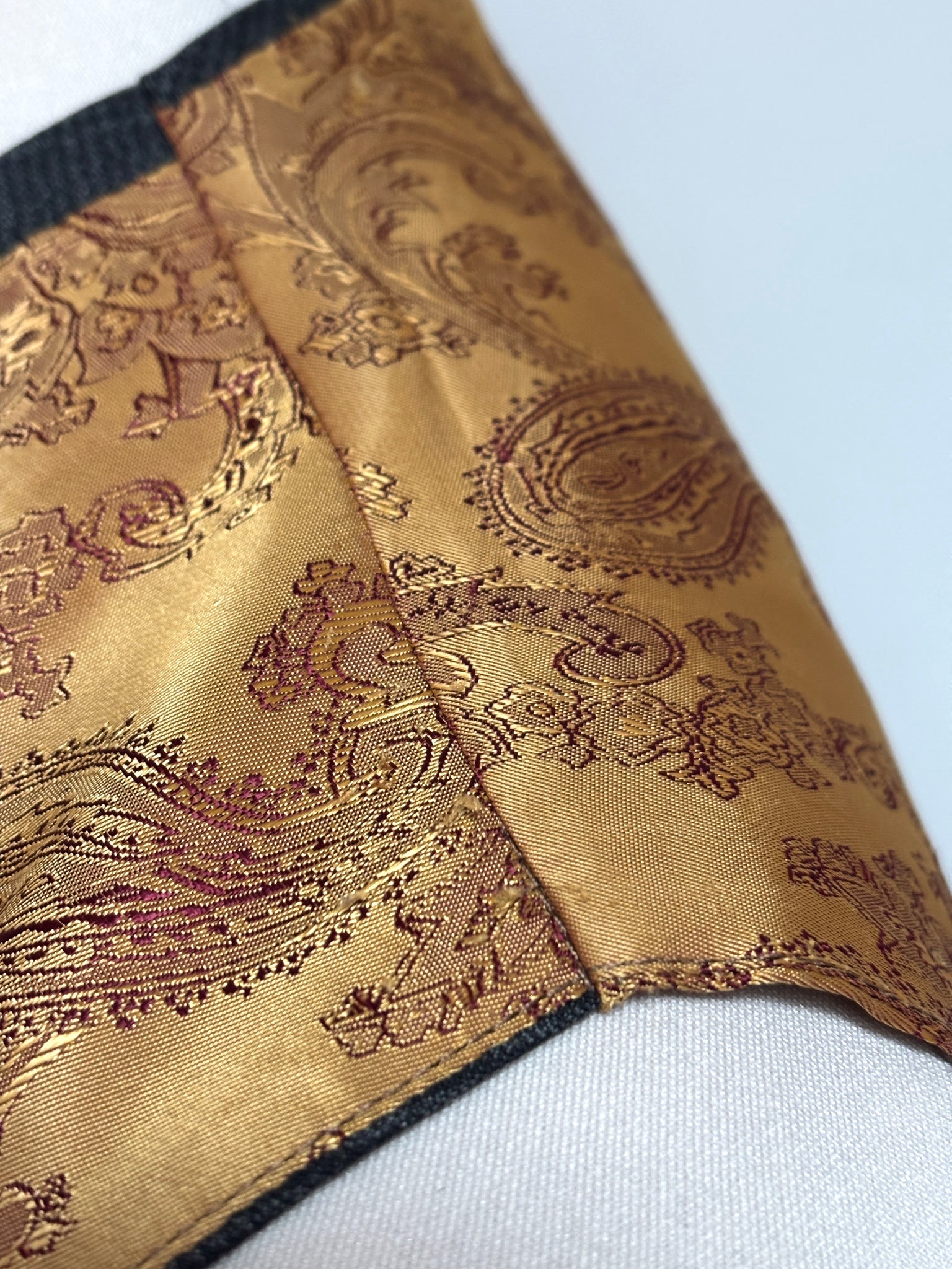 Caractéristiques : Tissu en laine mélangée à carreaux fenêtre, patte à cinq boutons, deux poches à l'avant, boucle réglable à l'arrière. Entièrement doublé. Superbe doublure soyeuse moutarde doré à motif paisley. Coloris : Gris anthracite