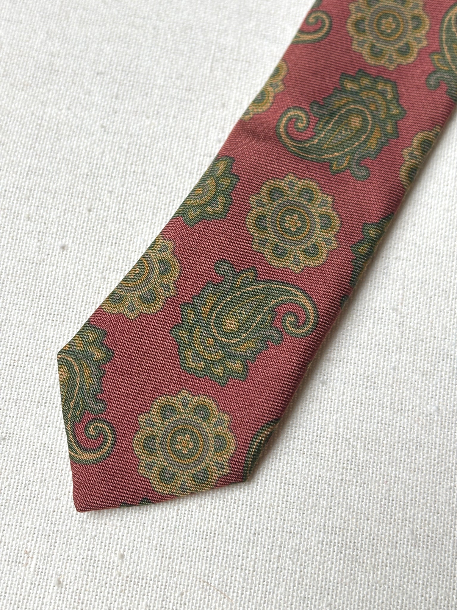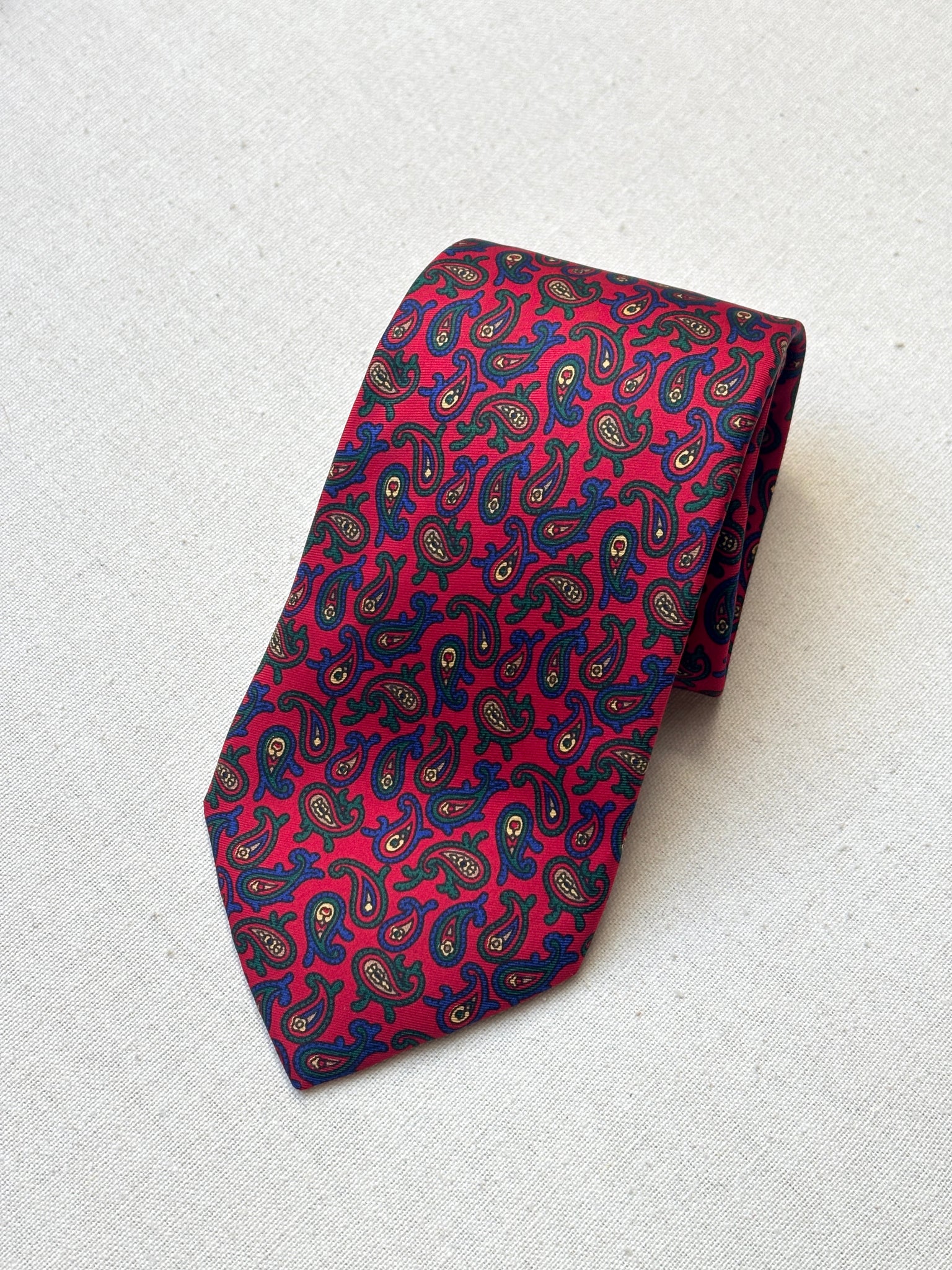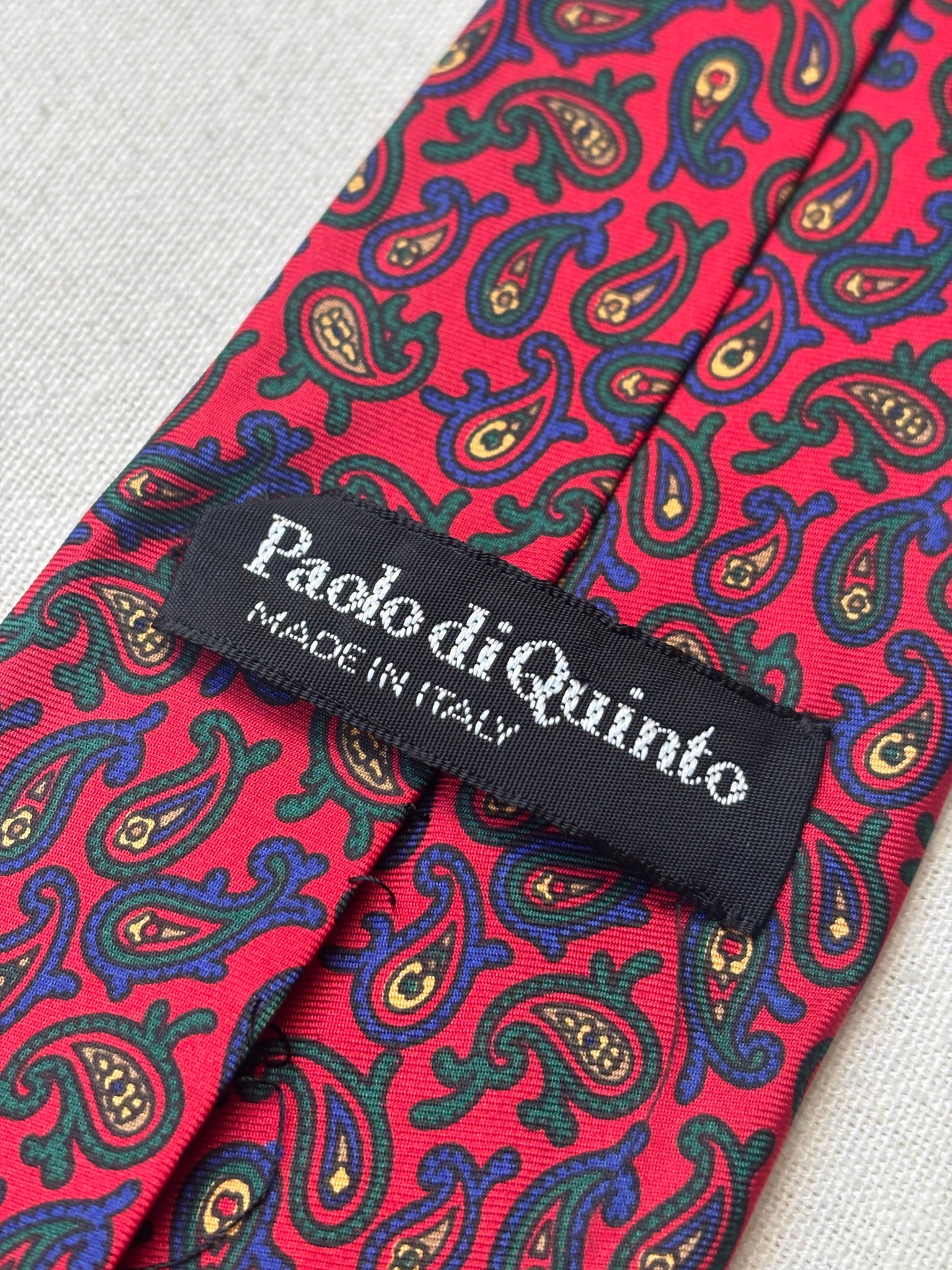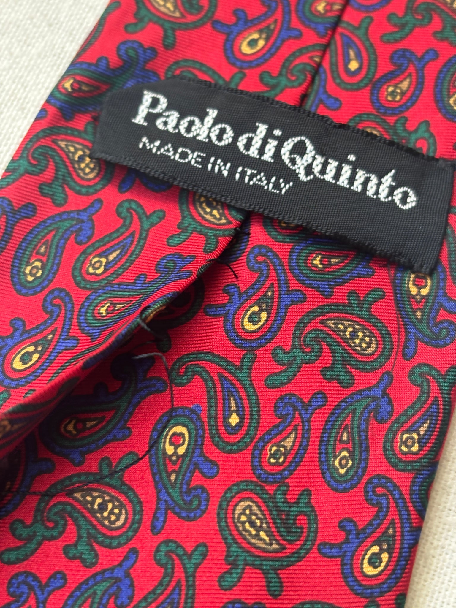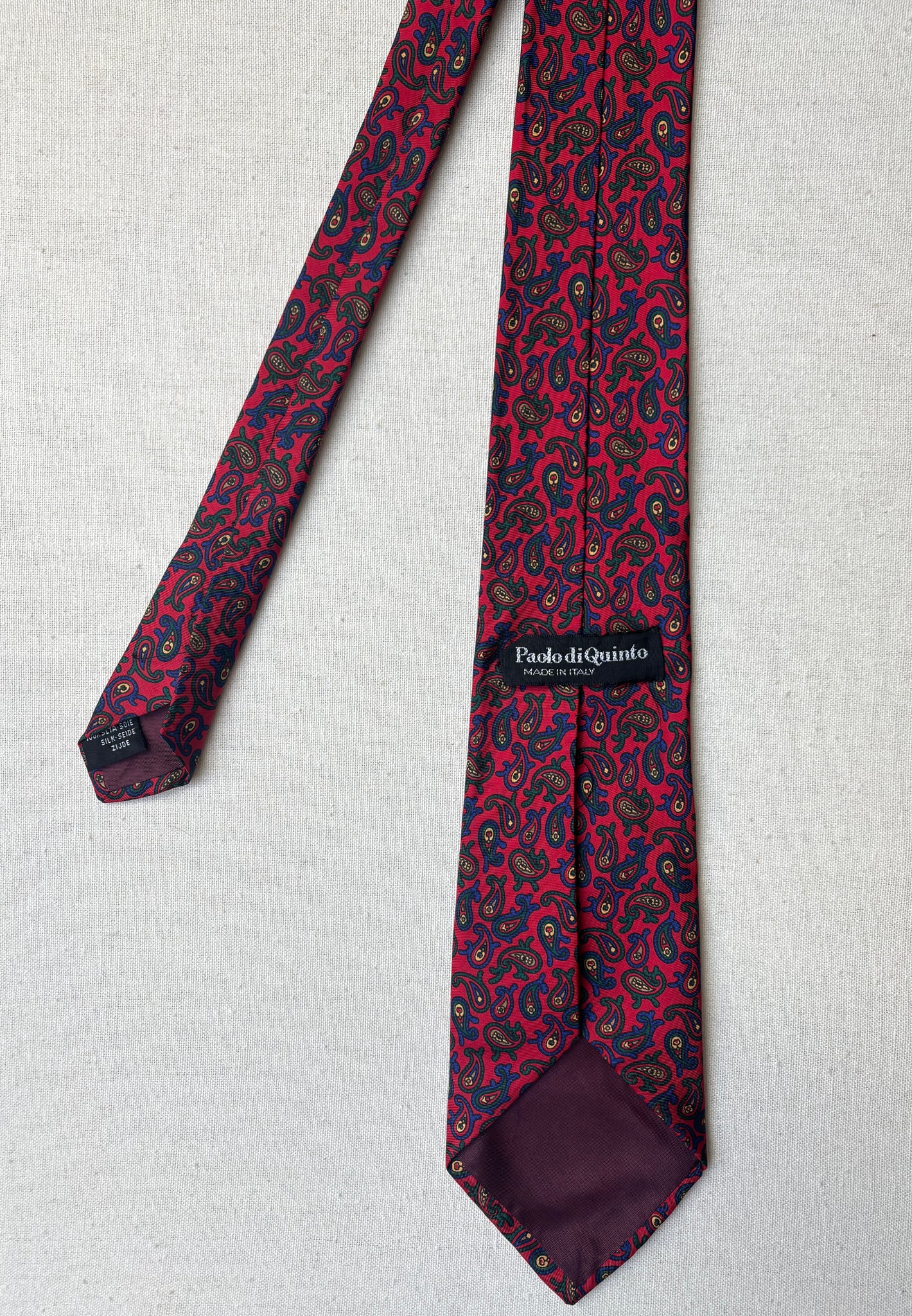 3/ Cravate rouge en soie à motif paisley, griffée Paolo di Quinto, fabriquée en Italie.