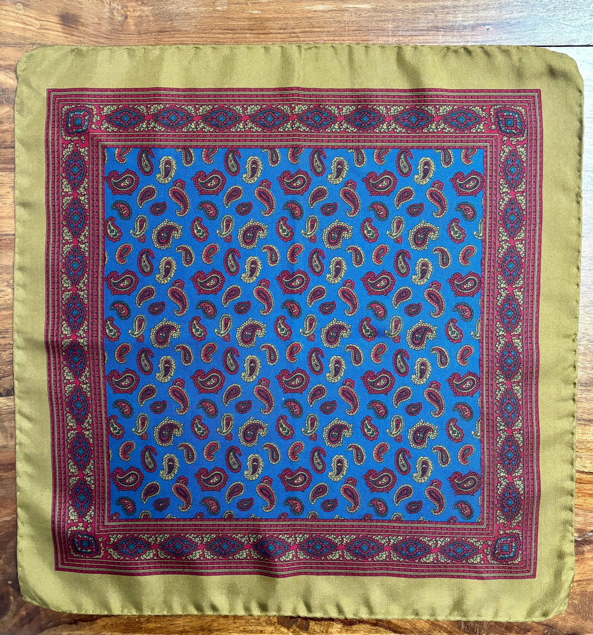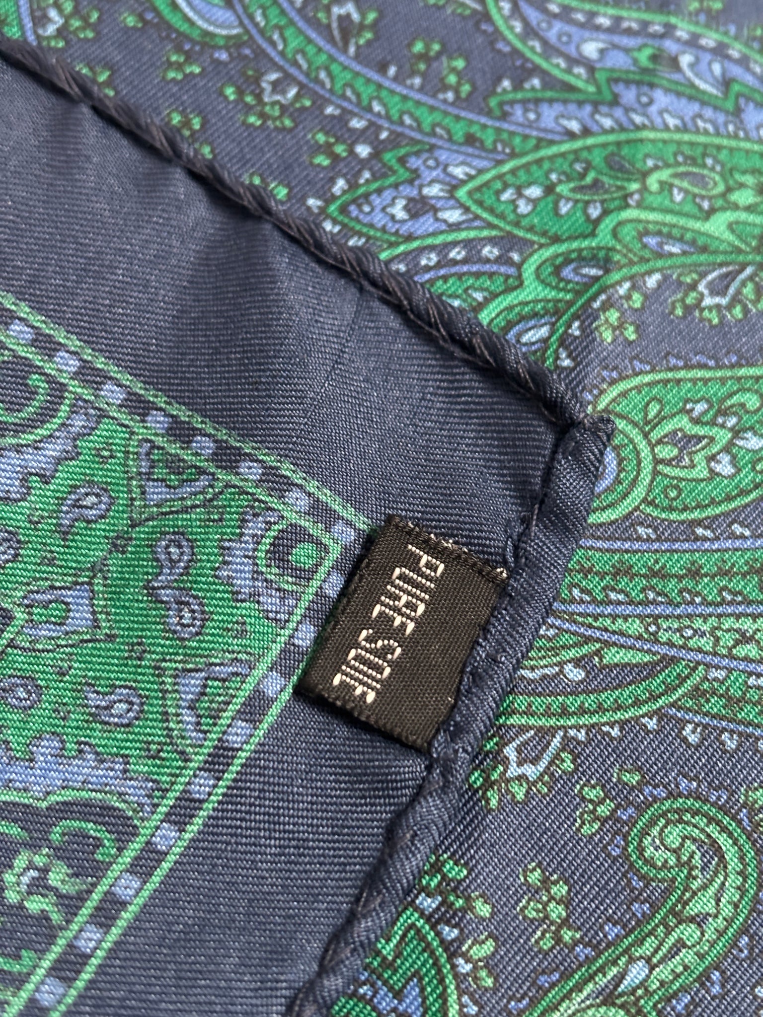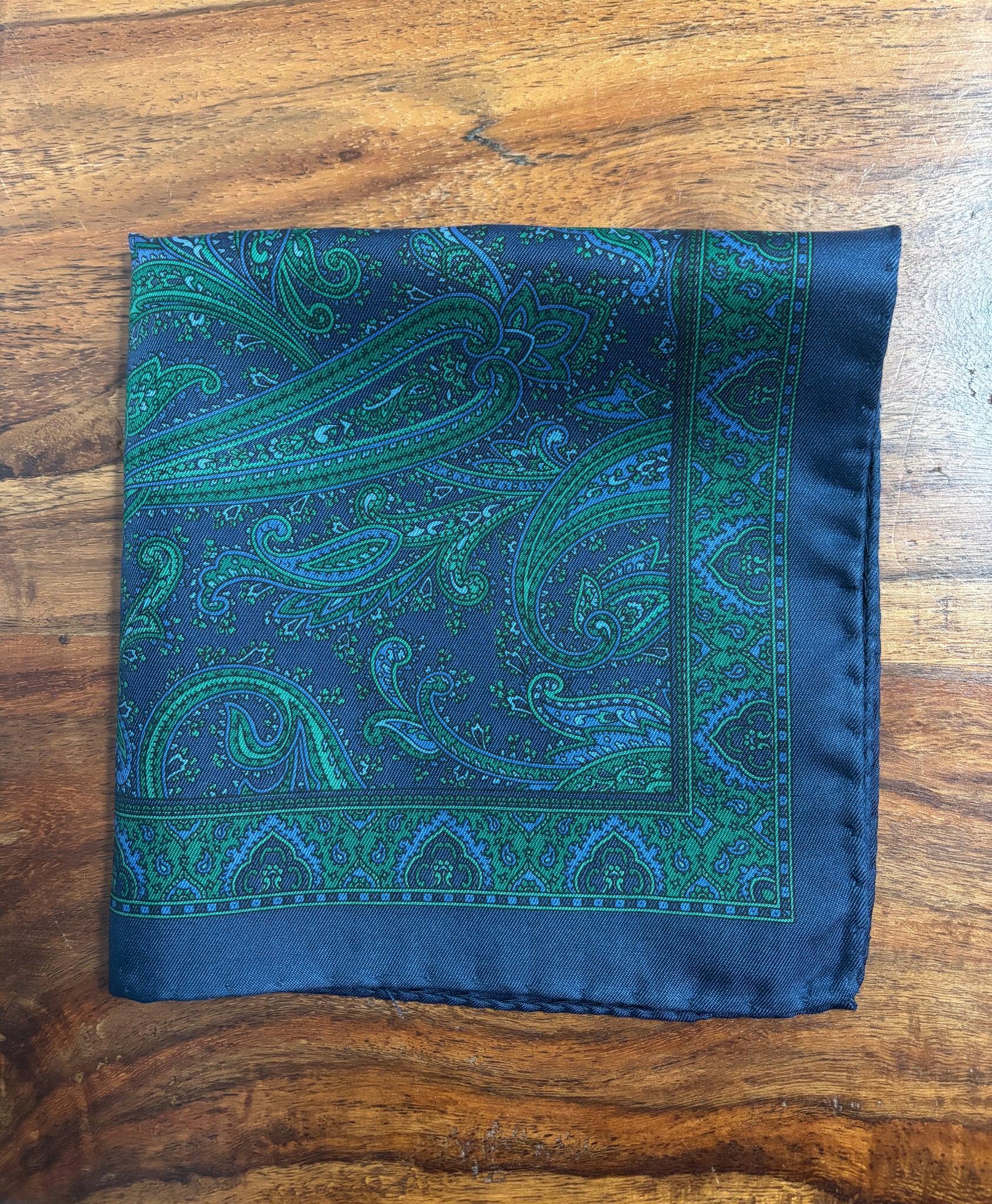 2/ Pochette paisley verte et bleue en soie, fabriquée en Italie